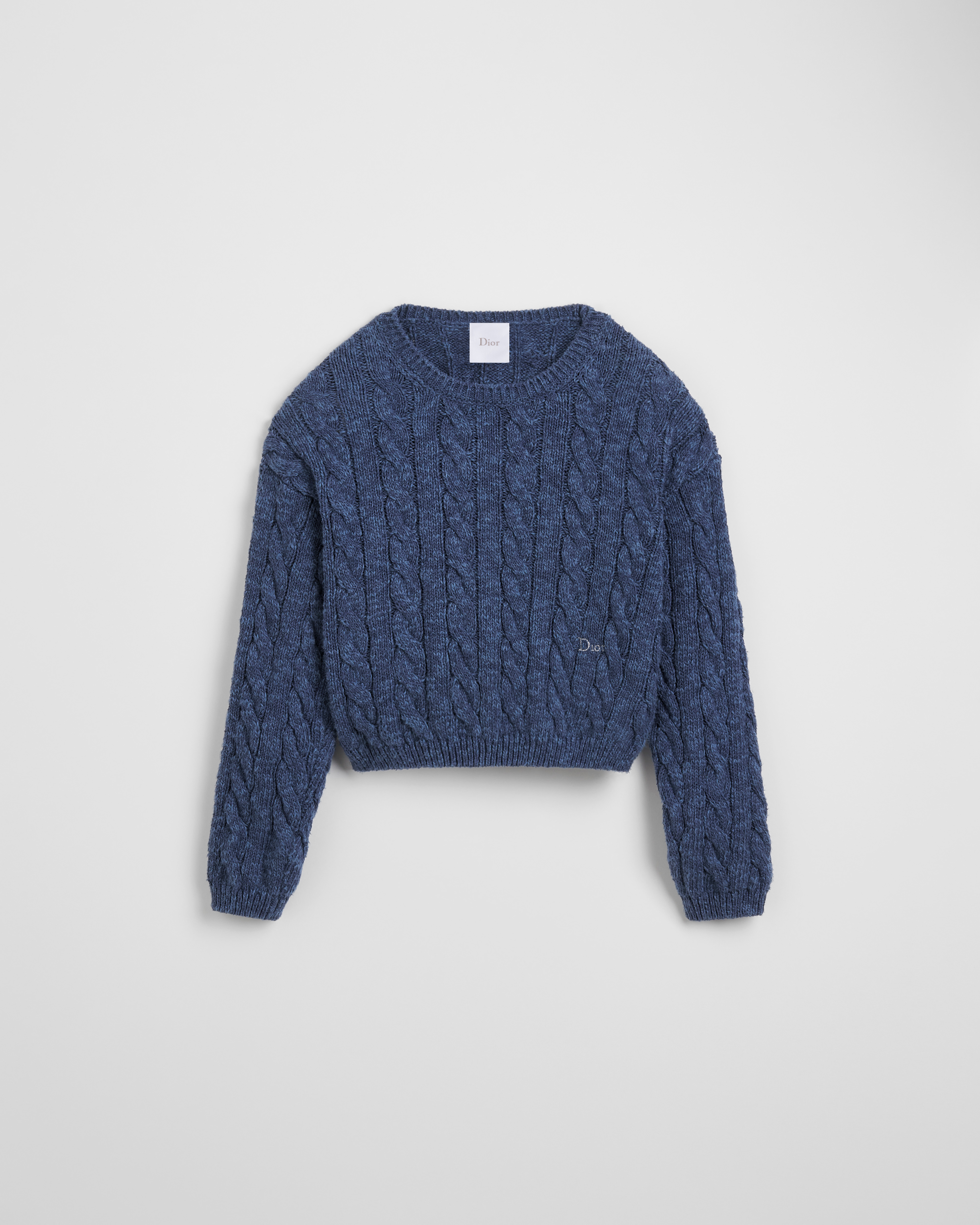 这款针织衫是二零二六秋季童装系列新品,绞花针织设计别具一格。采用蓝色色调棉质和桑蚕丝混纺针织面料精心制作,腰部饰以银色调 Dior 刺绣提升格调。搭配罗纹饰边提升格调,更添舒适,可与铃兰图案长款半身裙搭配,打造动感造型。