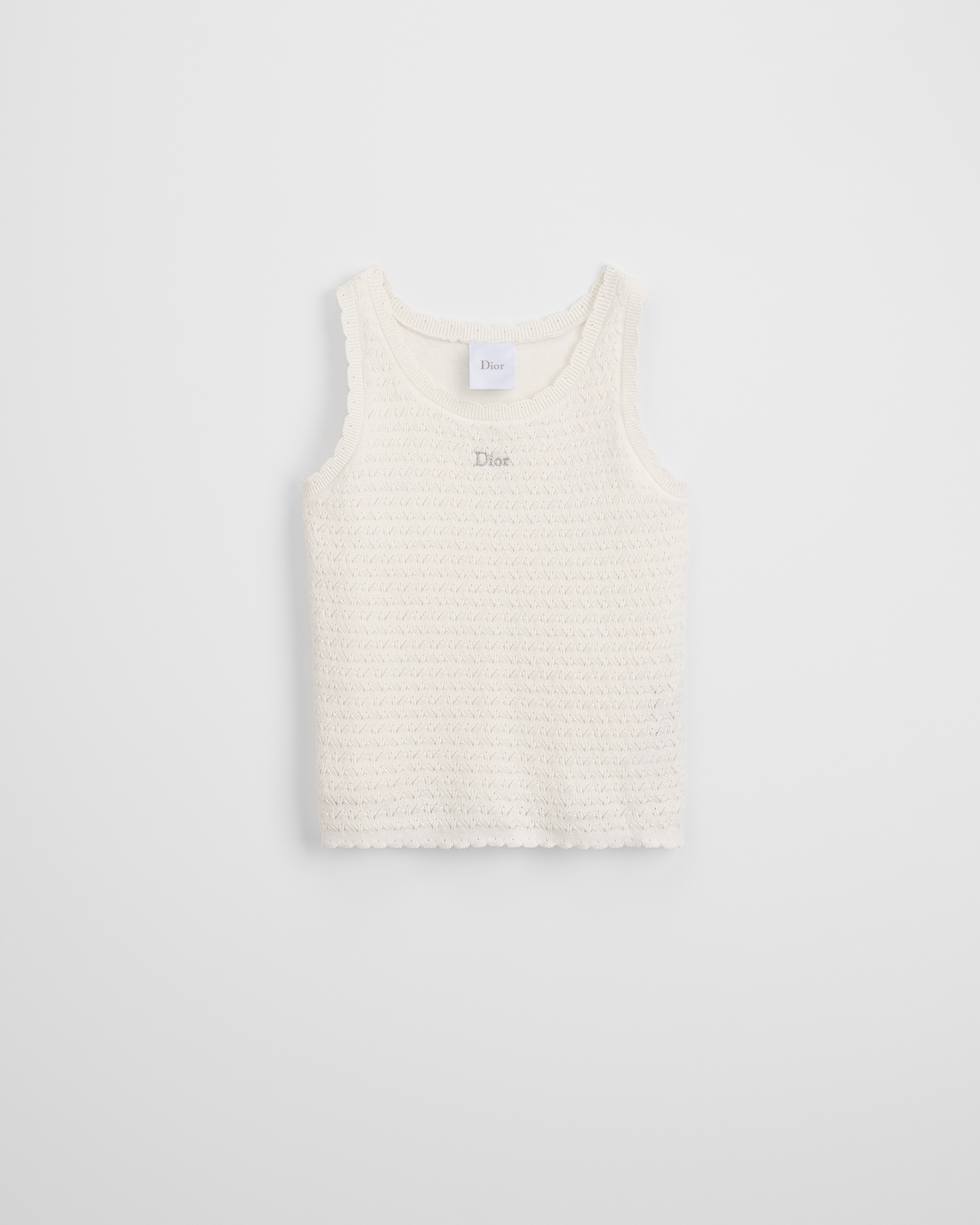 这款背心为优雅的镂空效果款式,别具一格。采用象牙色棉质镂空效果针织面料精心制作,正面饰以银色调 Dior 刺绣。饰以精致的同色调饰边,可与该系列的配套开衫和半身裙搭配,打造时尚而轻盈的精致当季造型。