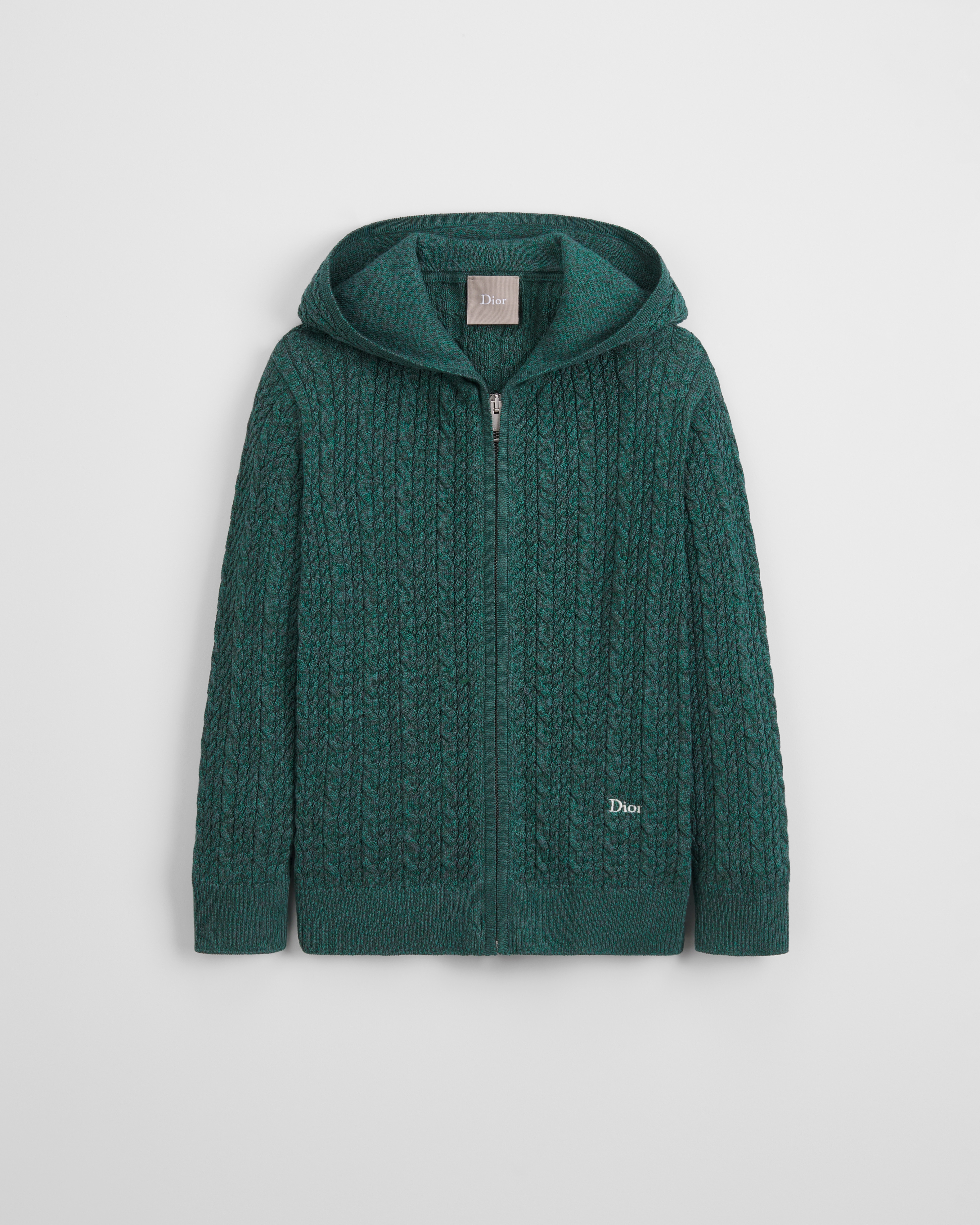 这款开衫饰以精致的绞花针织图案。采用绿色和灰色棉质混纺针织面料精心制作,搭配连帽和罗纹饰边,更添舒适。正面拉链开合,腰部饰以 Dior 刺绣提升格调。可与该系列的 T 恤叠搭,为凉爽的夜晚打造活力造型。