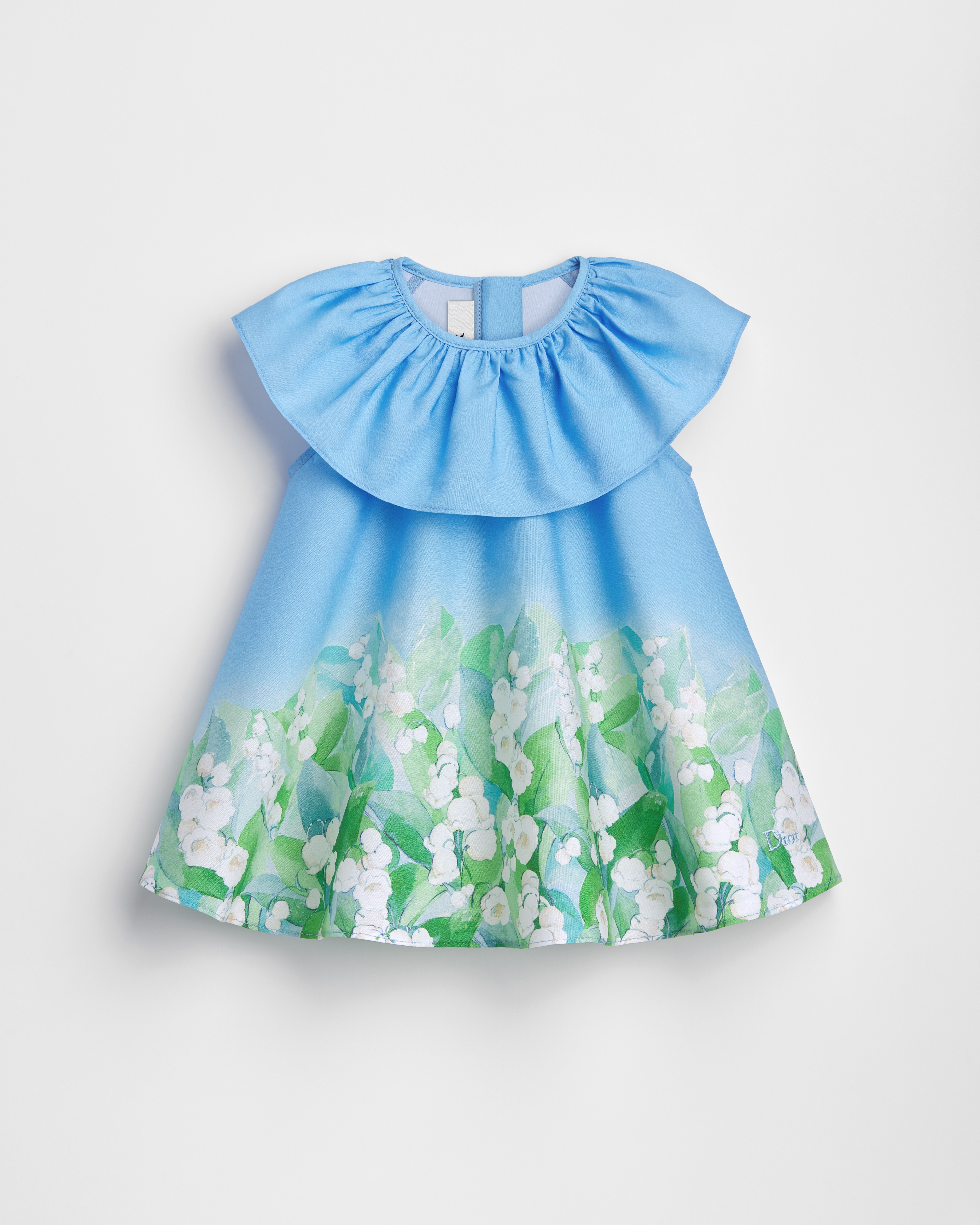 这款连衣裙以大号设计重新诠释 Dior 经典的铃兰图案。采用蓝色棉府绸面料精心制作,饰以多色印花,荷叶边衣领搭配背面拉链开合。下摆饰以淡蓝色 Dior 刺绣提升格调,可与该系列的芭蕾鞋搭配,打造清新的造型。