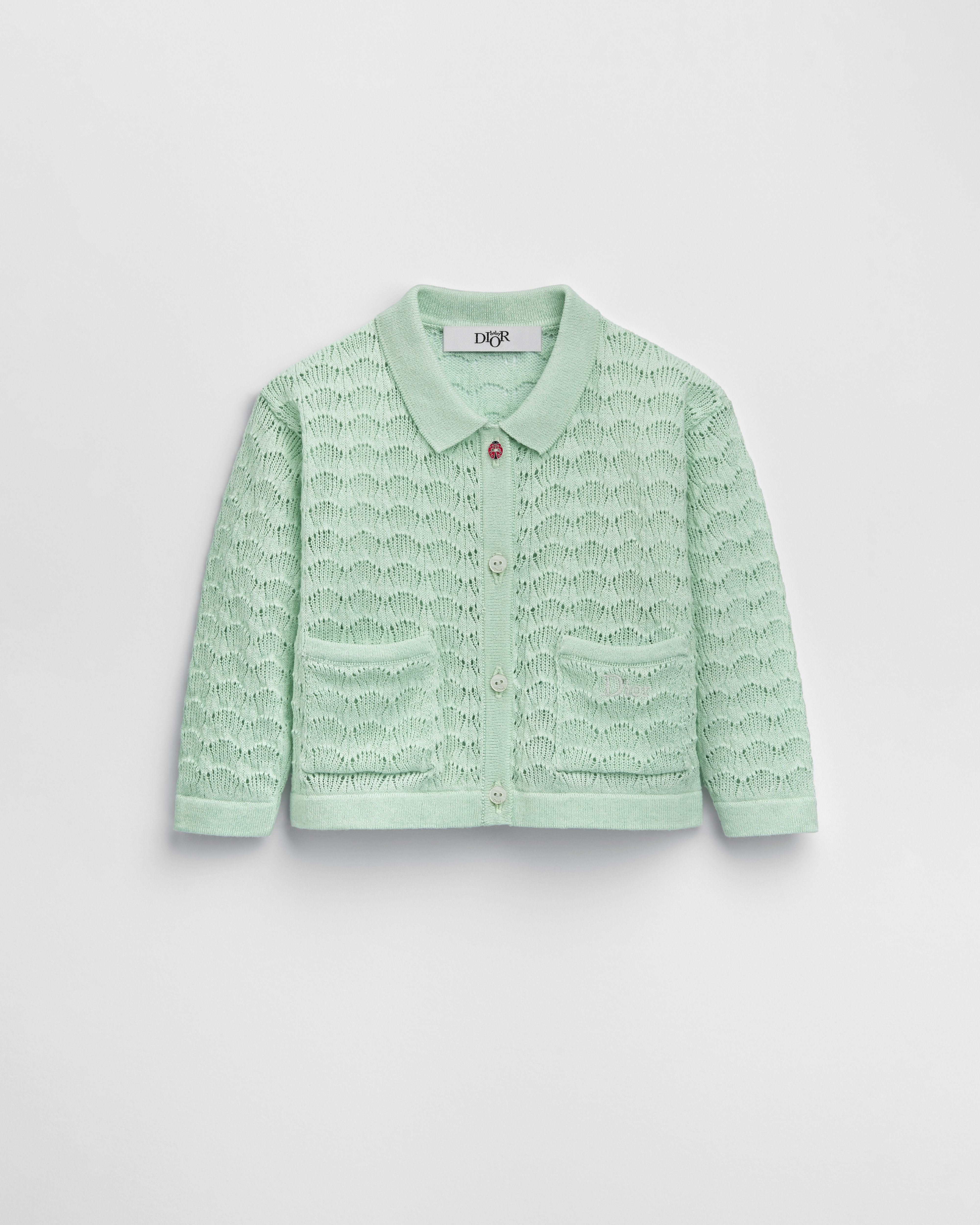这款开衫为优雅的镂空效果款式,别具一格。采用灰绿色棉质和亚麻混纺镂空效果针织面料精心制作,搭配贴袋和罗纹饰边更添舒适。纽扣门襟,衣领饰以瓢虫纽扣,点缀象牙色 Dior 标志刺绣提升格调。可与该系列的 T 恤叠搭,打造优雅而轻盈的当季造型。