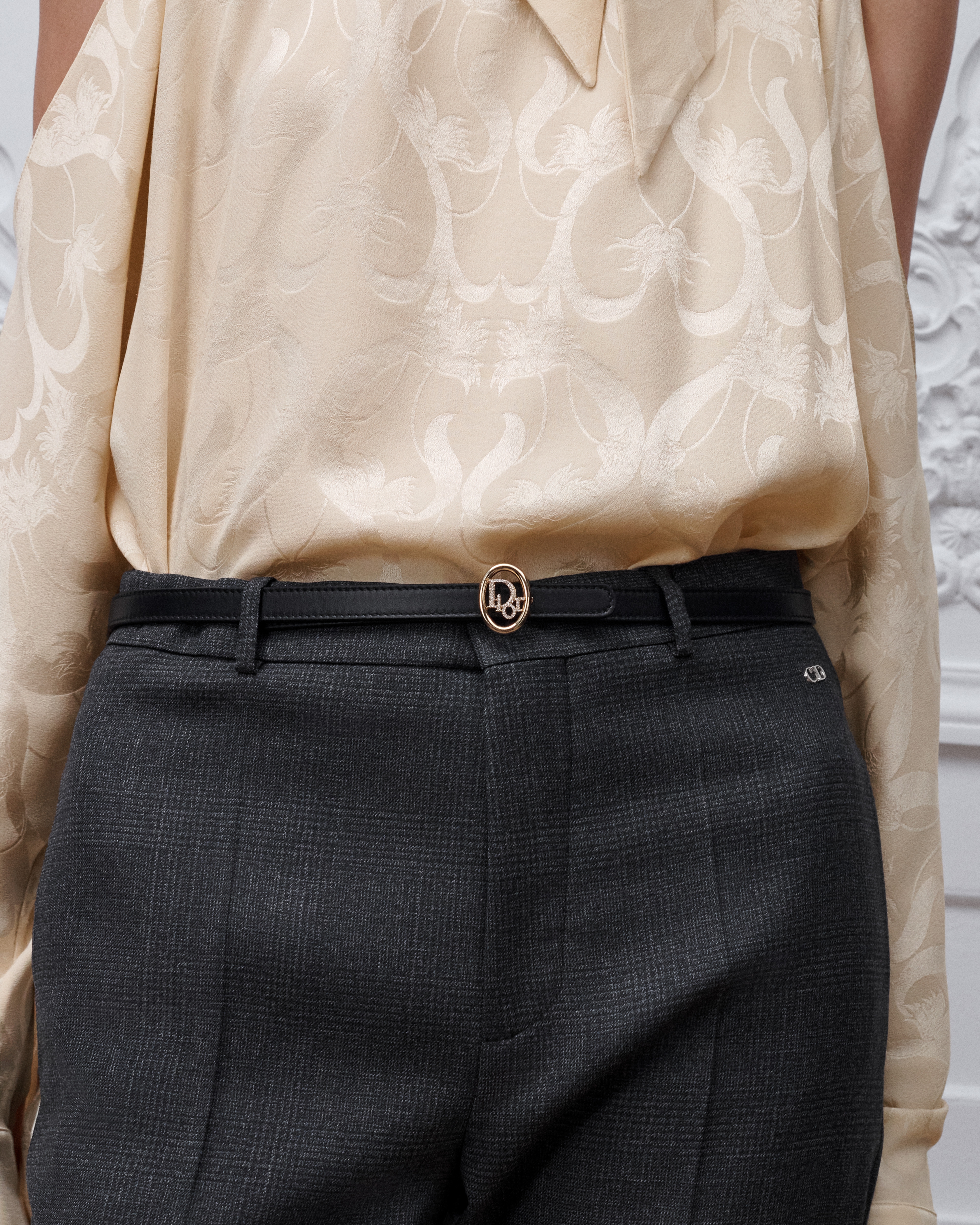 这款 Dior Oblique 腰带由乔纳森·安德森 (Jonathan Anderson) 设计,以图形风格椭圆腰带扣全新演绎 Dior 的经典图案。采用光滑牛皮革精心制作,双面设计,一面为黑色,另一面为粉笔米白色 (Craie),搭配富有光泽的金色饰面金属 Dior Oblique 腰带扣提升格调,字母密镶以精美的晶体。可与经典西装外套或连衣裙搭配,彰显优雅气质。