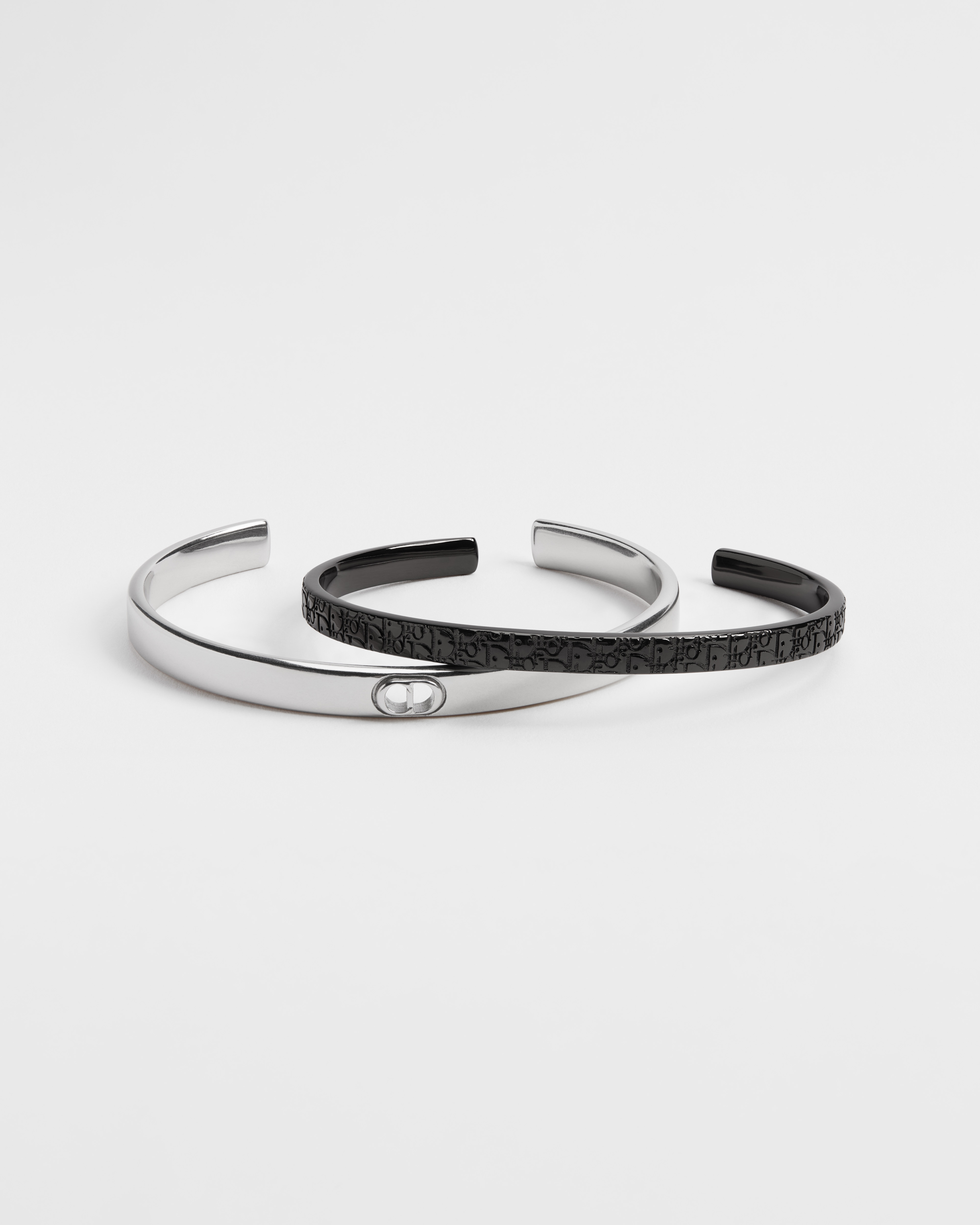 这款手镯套装以经典细节彰显特色。其中一个手镯采用金属覆层铜合金精心制作,饰以镌刻 Dior Oblique 图案。另一个手镯以银色饰面铜合金打造,突显简约设计,并点缀以镂空 CD Icon 标志提升格调。可与其他 Dior Oblique 单品搭配,打造精致的造型。