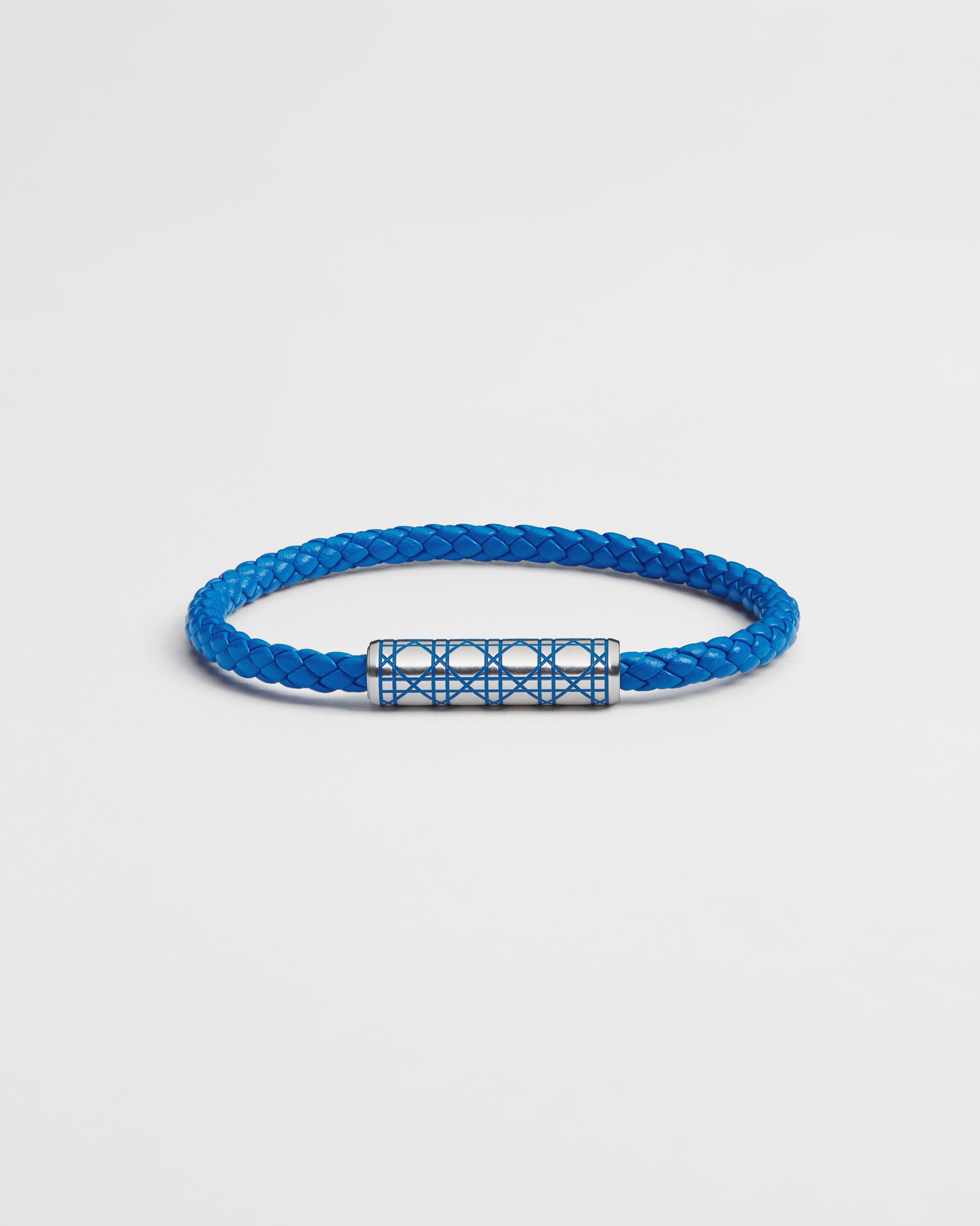 •  淡蓝色牛皮革、银色饰面铜合金和淡蓝色涂漆藤格纹
