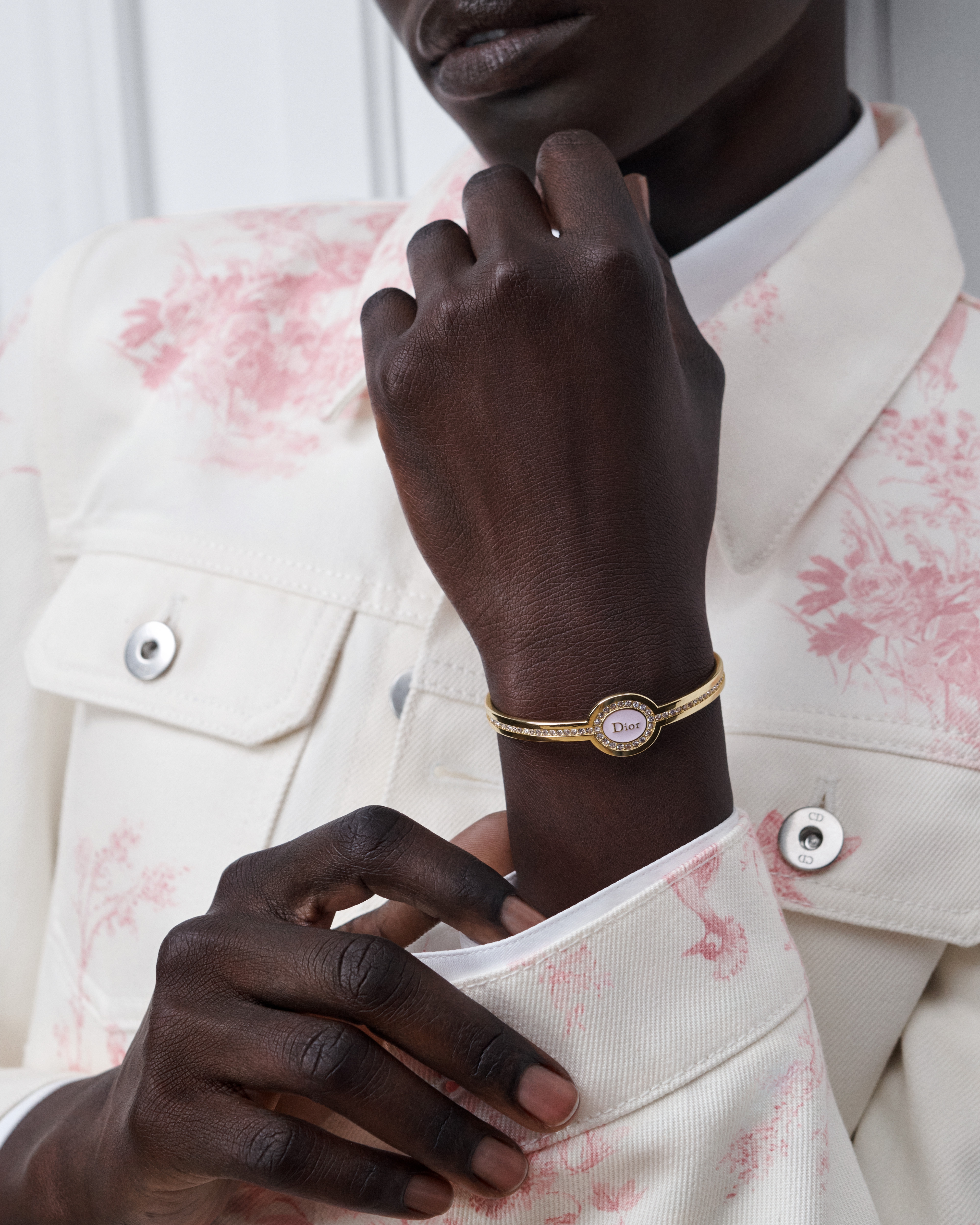 这款 Dior Core 手镯彰显时尚优雅的美学风格和高雅气质。金色饰面金属设计,饰以精美晶体,圆形饰牌中间点缀以 Dior 标志,搭配手工涂刷的柔粉色 (Rose Tendre) 涂漆。可与其他 Dior Core 单品搭配,打造配套造型。