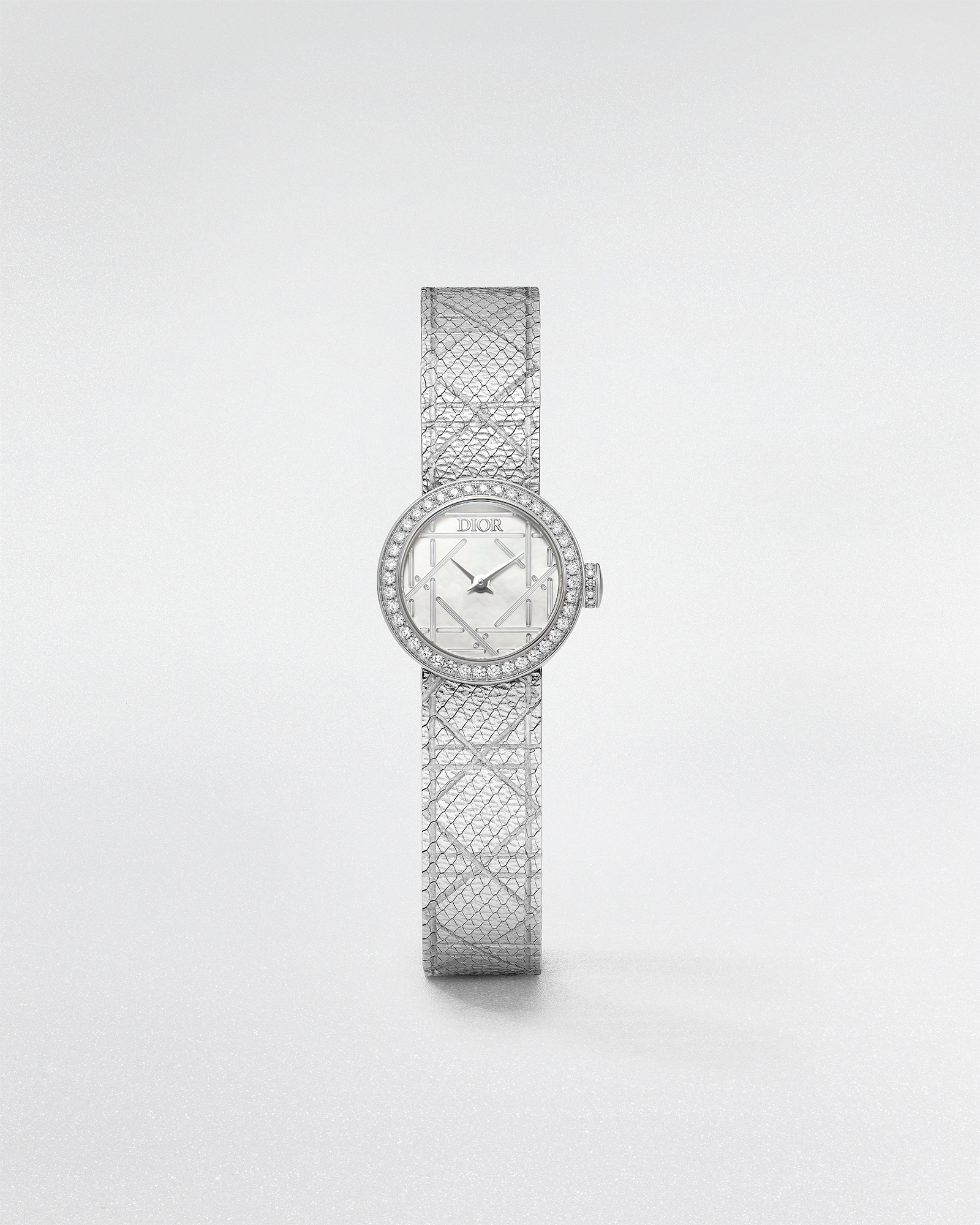 La D My Dior 腕表展现 Dior 先生珍视的藤格纹图案的生动线条,手工镌刻的表带和珍珠母贝表盘突显交织成趣的几何效果纹样。