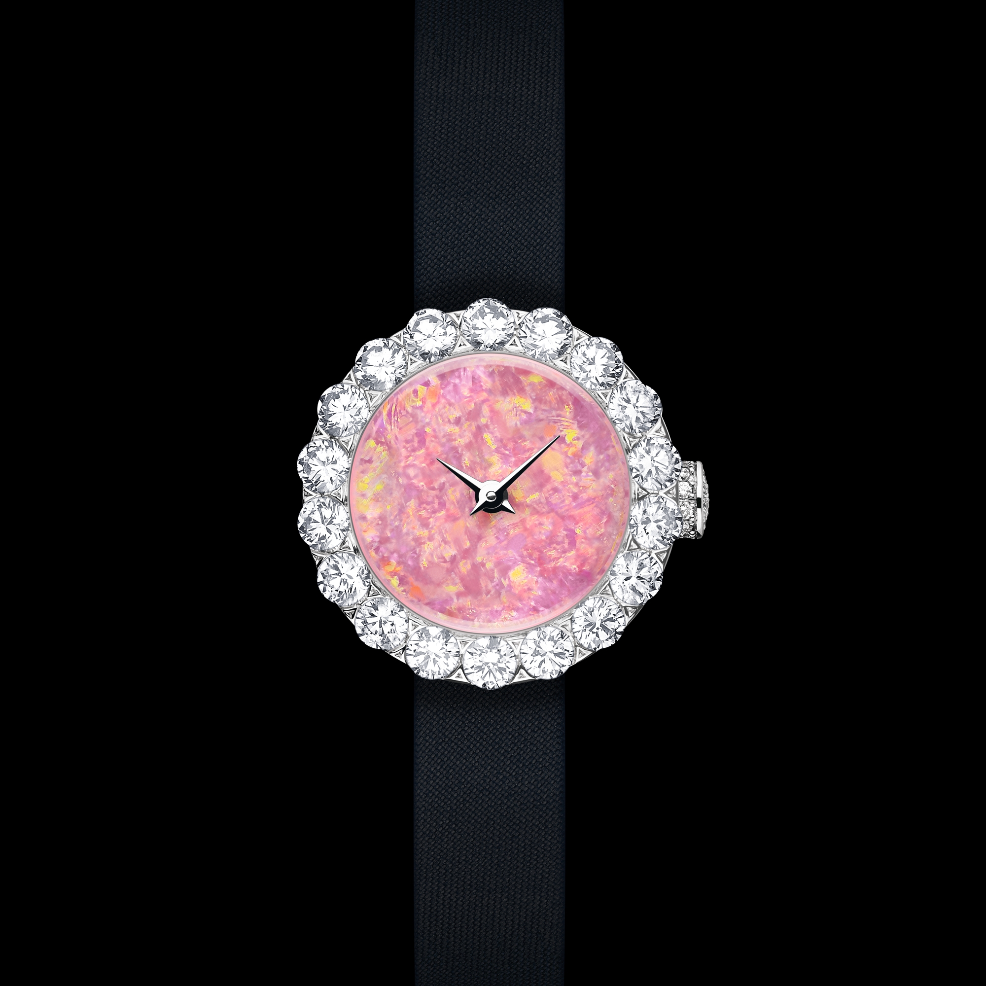 黑色绢缎表带,折叠式白金表扣镶嵌钻石。
