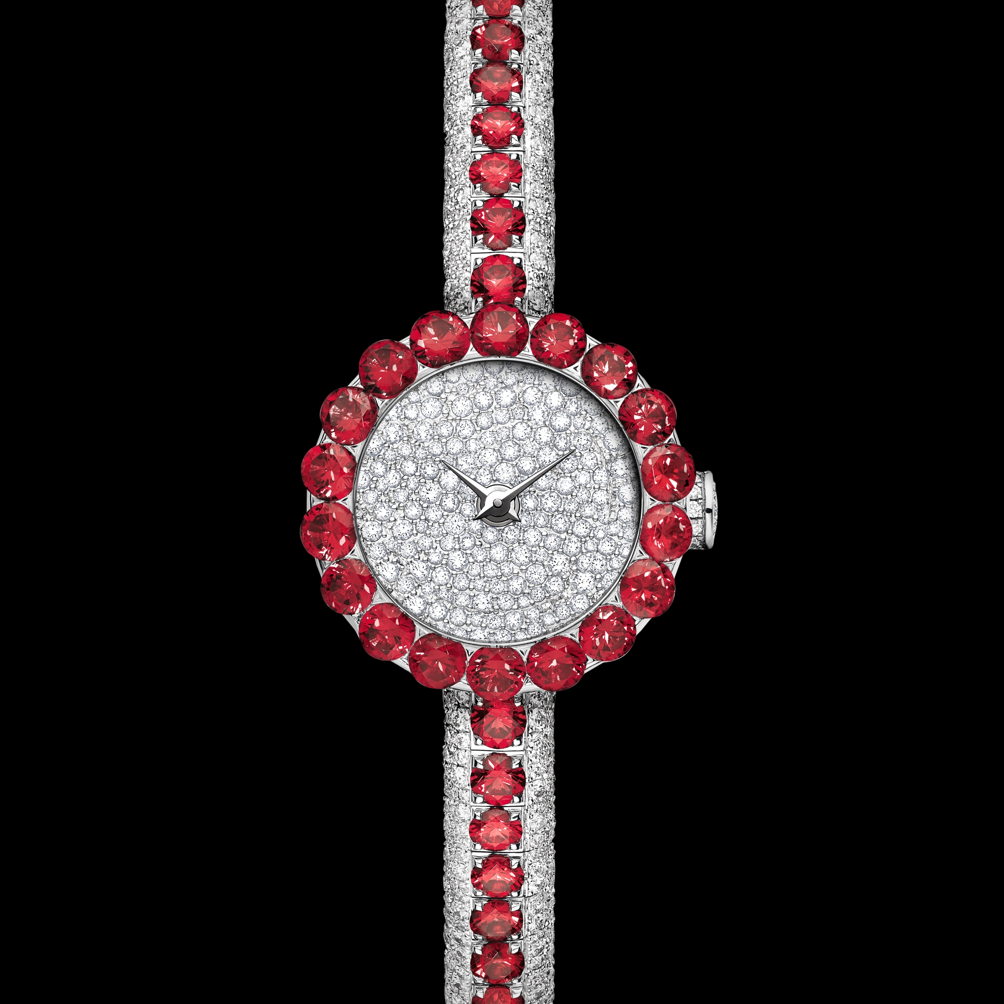 21毫米白金表壳,表圈镶嵌红宝石和钻石,表冠镶嵌钻石。