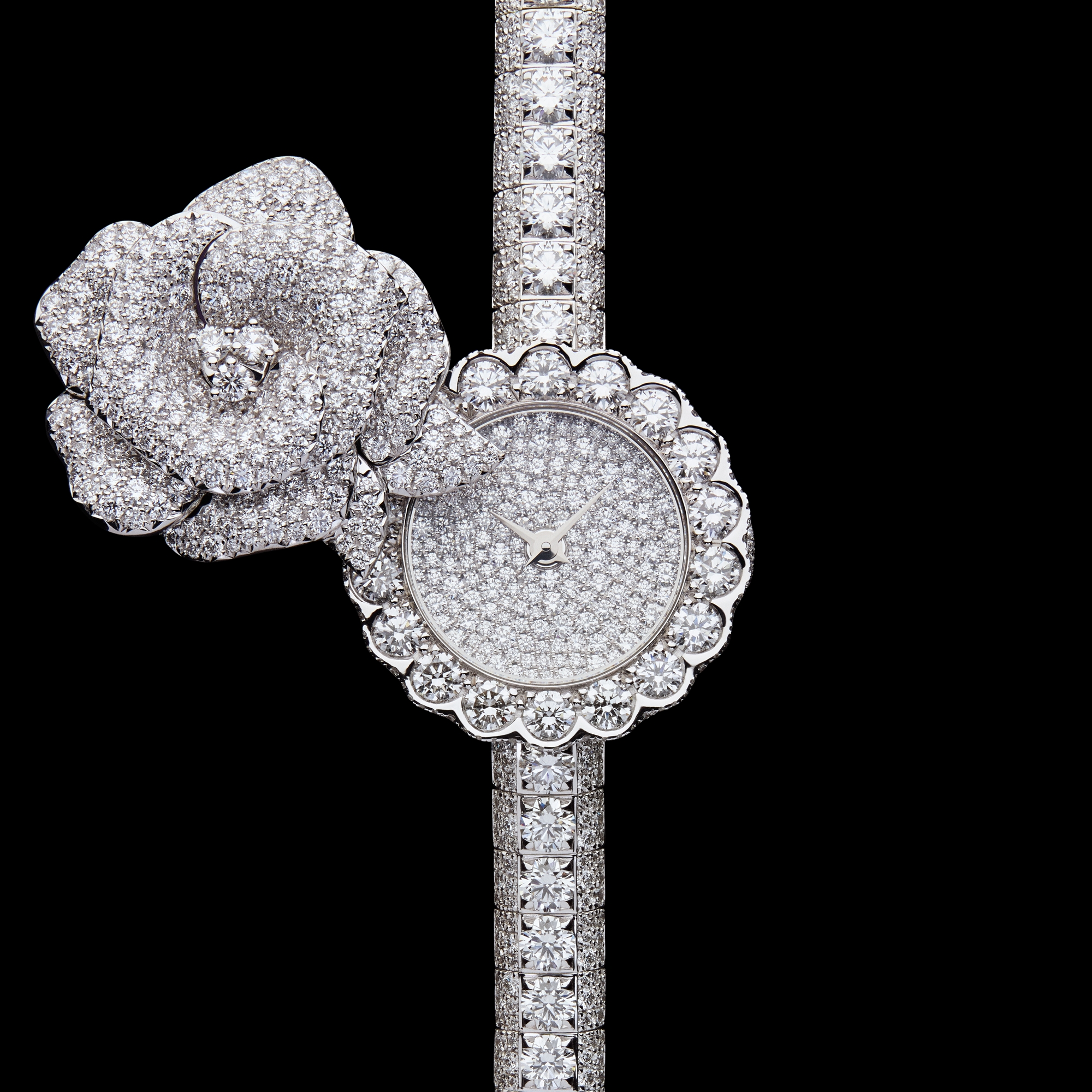 白色 K 金表带镶嵌有钻石,并密镶以雪花镶嵌钻石,搭配白色 K 金隐形扣。