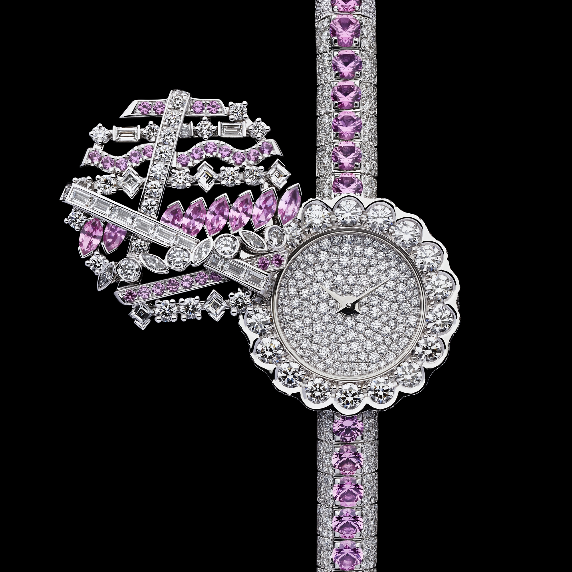 旋转表盖镶嵌以明亮式切割、榄尖形切割和长阶梯形切割钻石以及榄尖形切割和明亮式切割粉色蓝宝石。