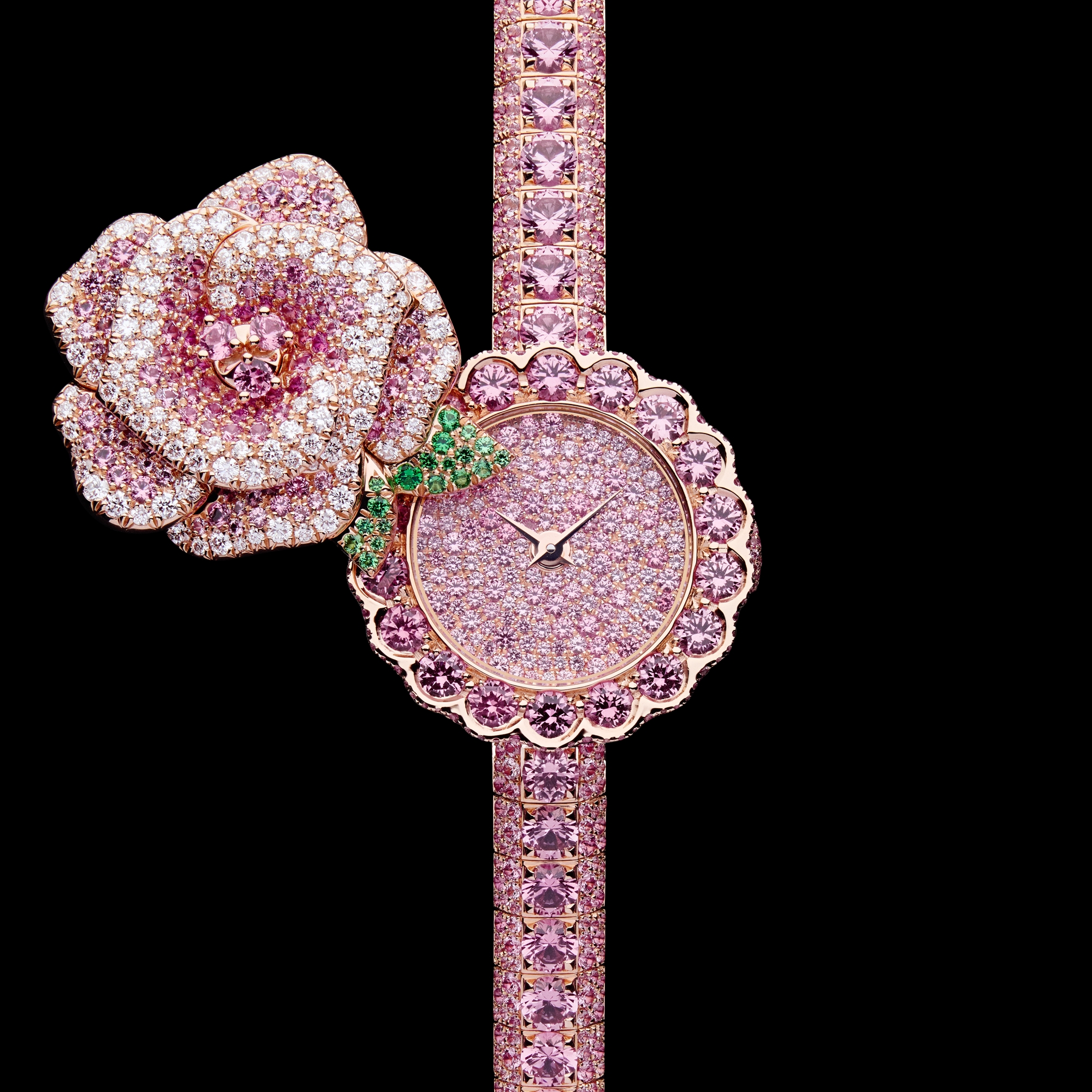 玫瑰色 K 金表盘饰密镶以雪花镶嵌粉色蓝宝石,搭配抛光的玫瑰色 K 金太子妃指针。