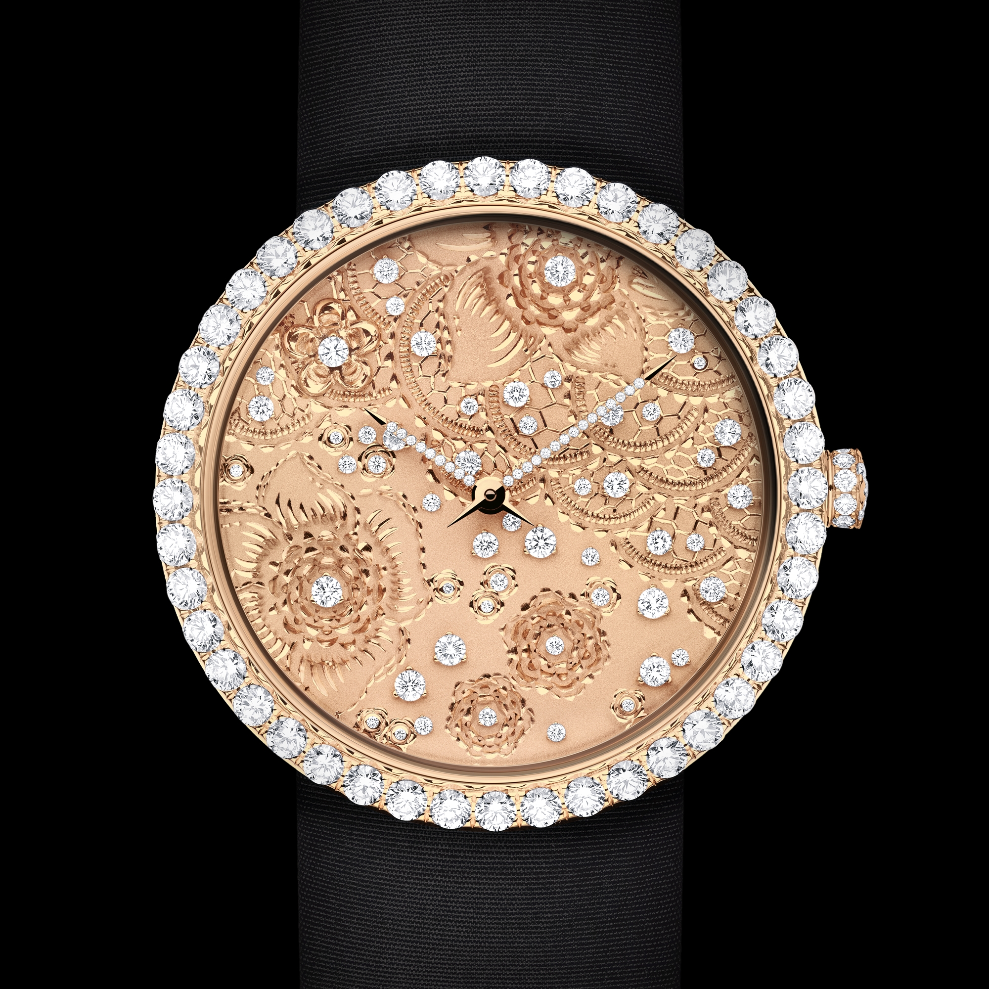 手工立体镌刻哑光玫瑰金表盘,镶嵌钻石,玫瑰金指针镶嵌钻石。