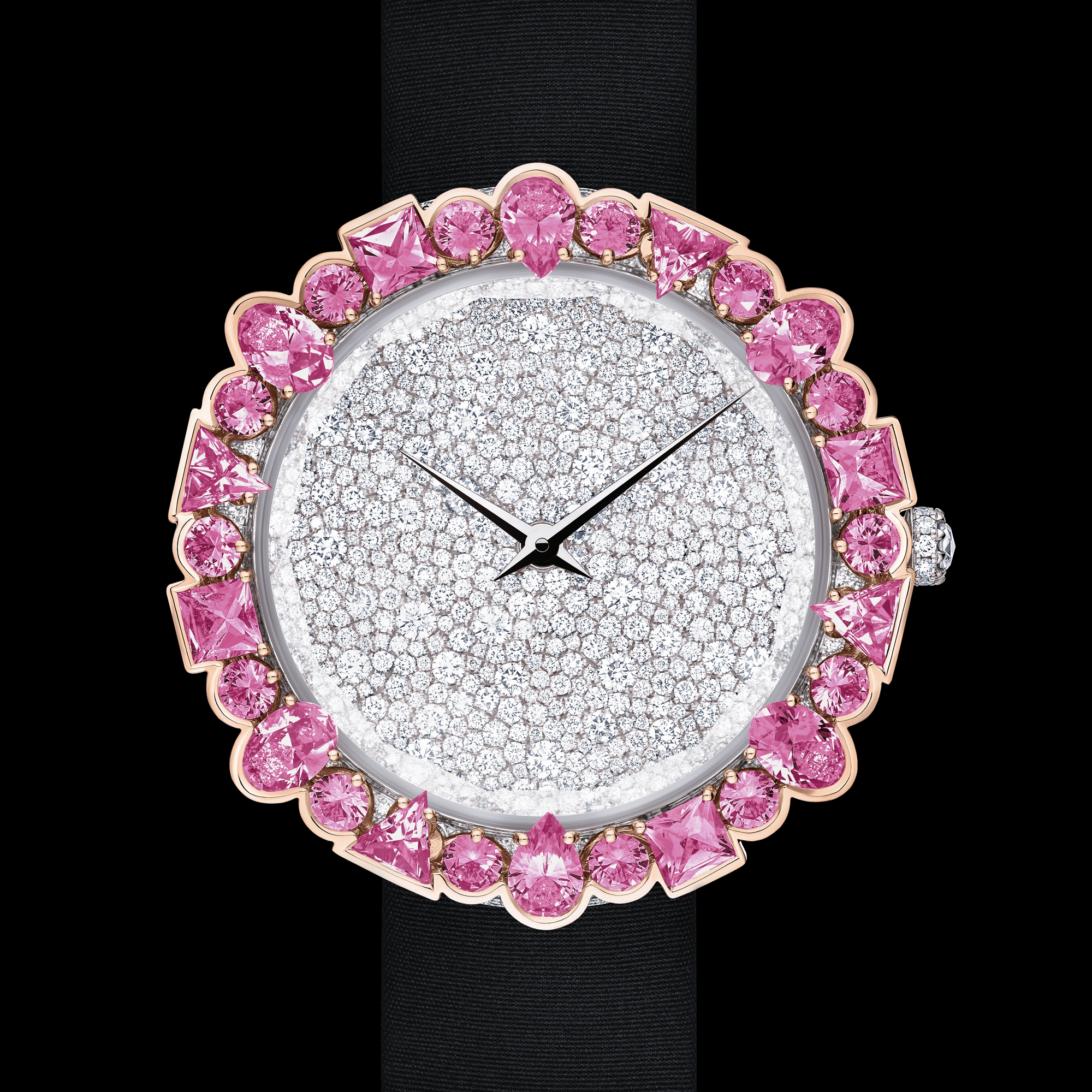 38毫米白金表壳,玫瑰金表圈镶嵌梨形、公主式、三角形和明亮式切割粉红色蓝宝石,表肩使用雪花镶嵌法铺镶钻石,表冠铺镶钻石并镶嵌一颗玫瑰式切割钻石,刻面蓝宝石水晶玻璃表镜。