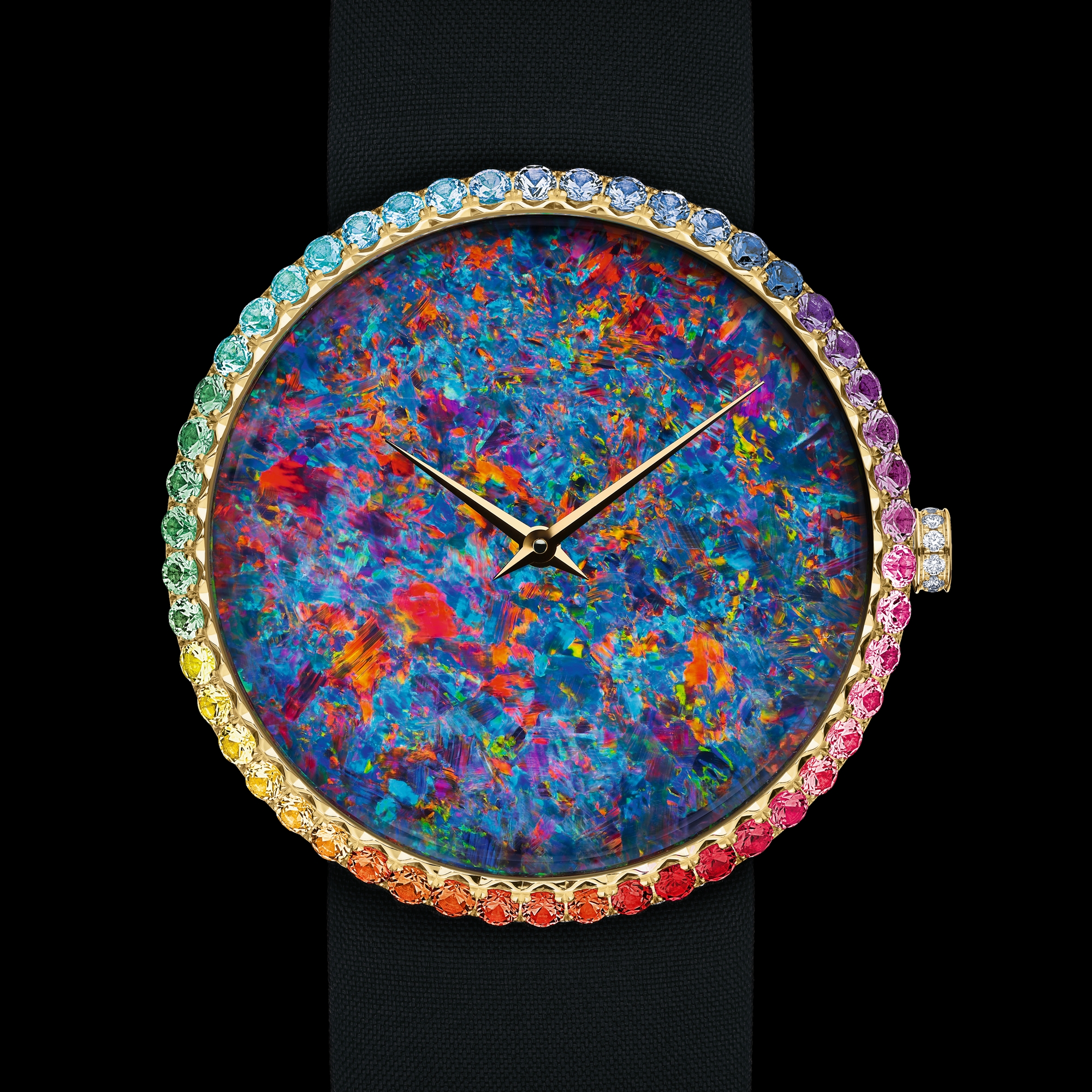 黑色塔夫绸桑蚕丝材质表带,黄色 K 金折叠表扣镶嵌以钻石