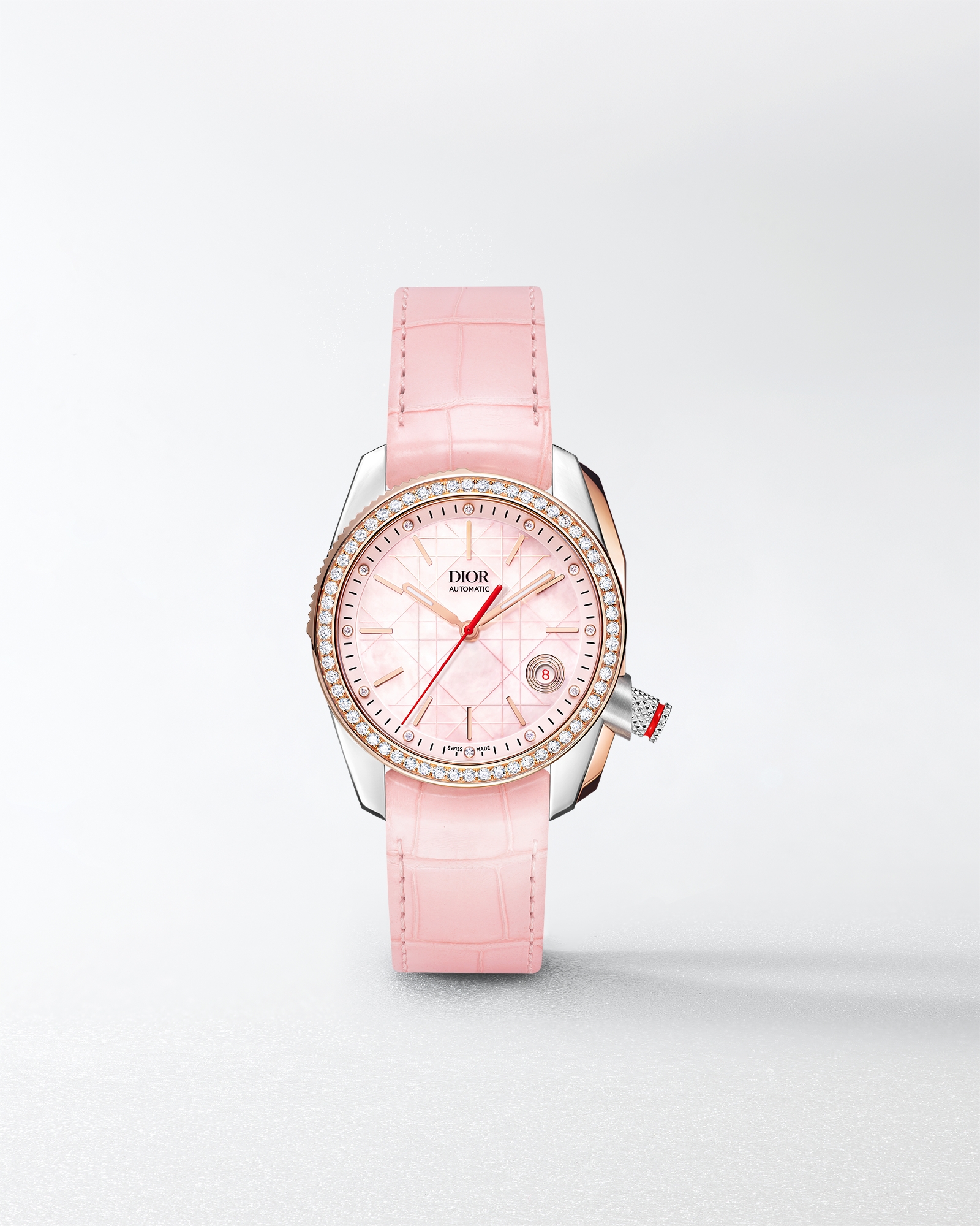 粉色珍珠母贝表盘,饰以藤格纹图案