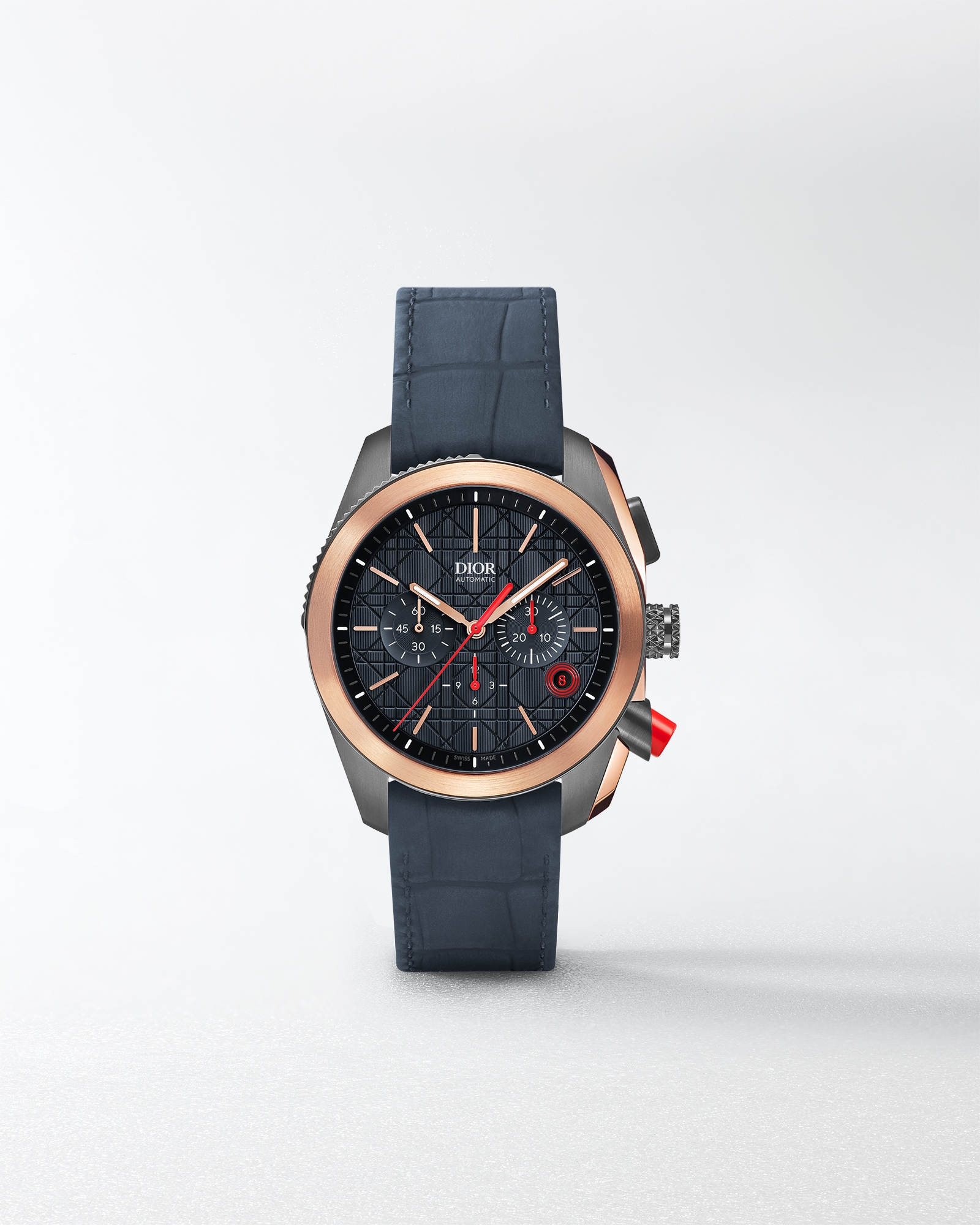 镌刻以 CD 标志的表冠,4 点钟位置设有红色计时码表按钮,具有停止/重启功能