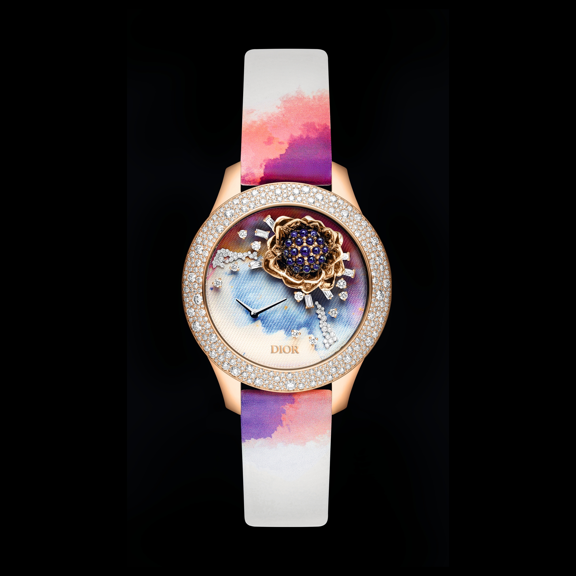 采用色彩斑斓的织物打造,巧妙呈现烧花效果。镶嵌有长阶梯形切割和明亮式切割钻石,饰以抛光玫瑰色 K 金花朵,点缀以蛋面切割蓝宝石,白色 K 金刻面时针和分针。