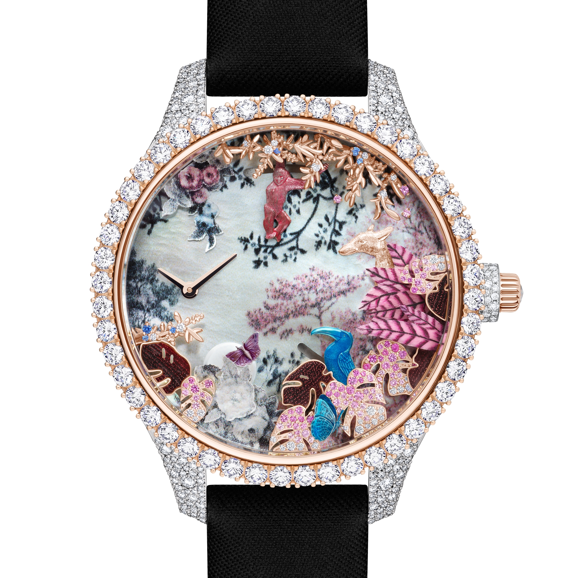 印花珍珠母贝表盘,饰以玫瑰色 18K 金枝叶,镶嵌钻石(0.02 克拉*)和蓝色蓝宝石(0.02 克拉*)