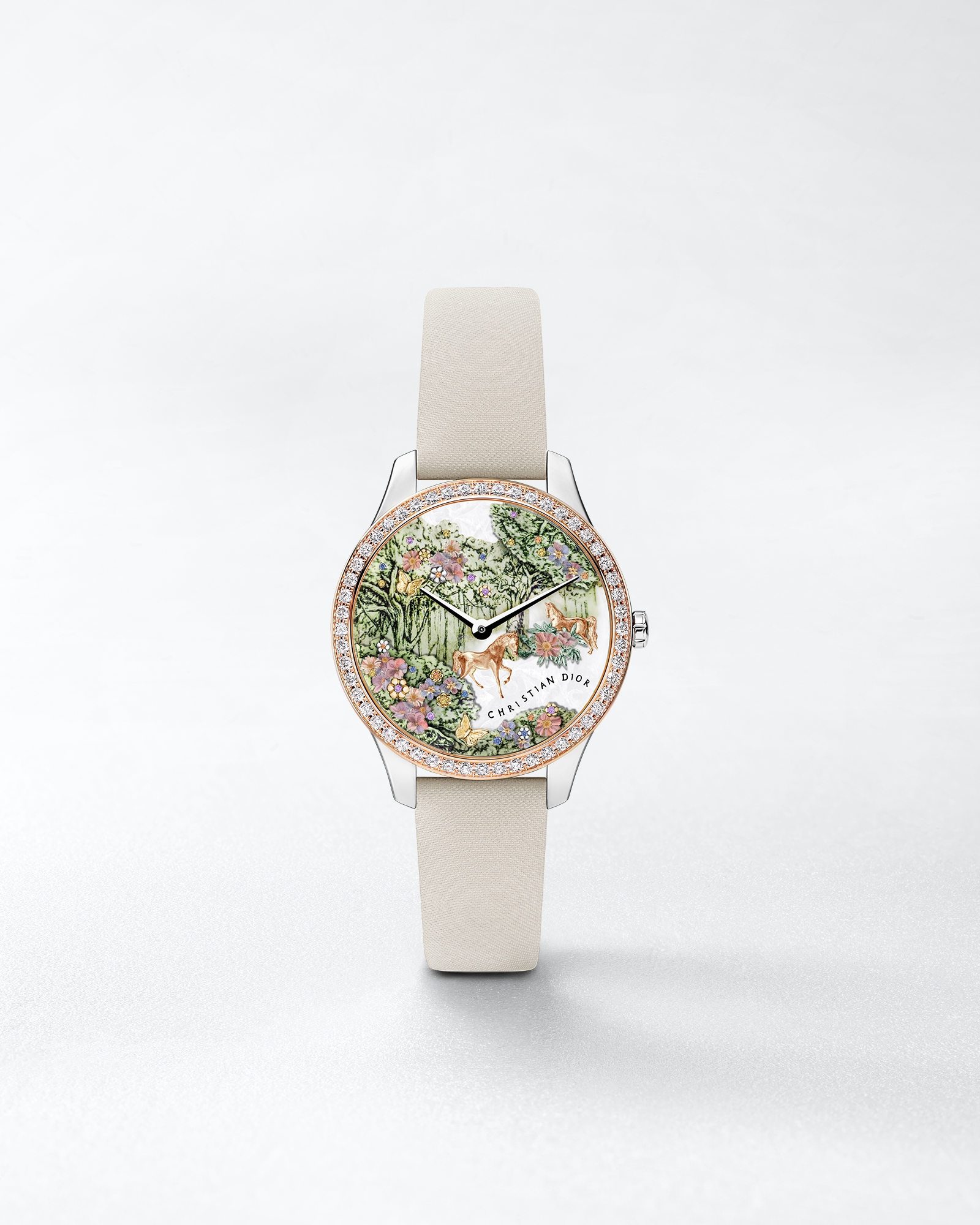 每年,Dior Grand Soir 系列都会以一个农历生肖为主题,推出体现工坊大胆创意和精湛工艺的作品。为庆祝马年的到来,这款非凡设计的表盘饰以焕新演绎的茹伊印花图案提升格调,点缀以由珍珠母贝、18K 金和绚丽宝石打造的珍贵梦幻森林,展现马儿穿行其间的姿态。