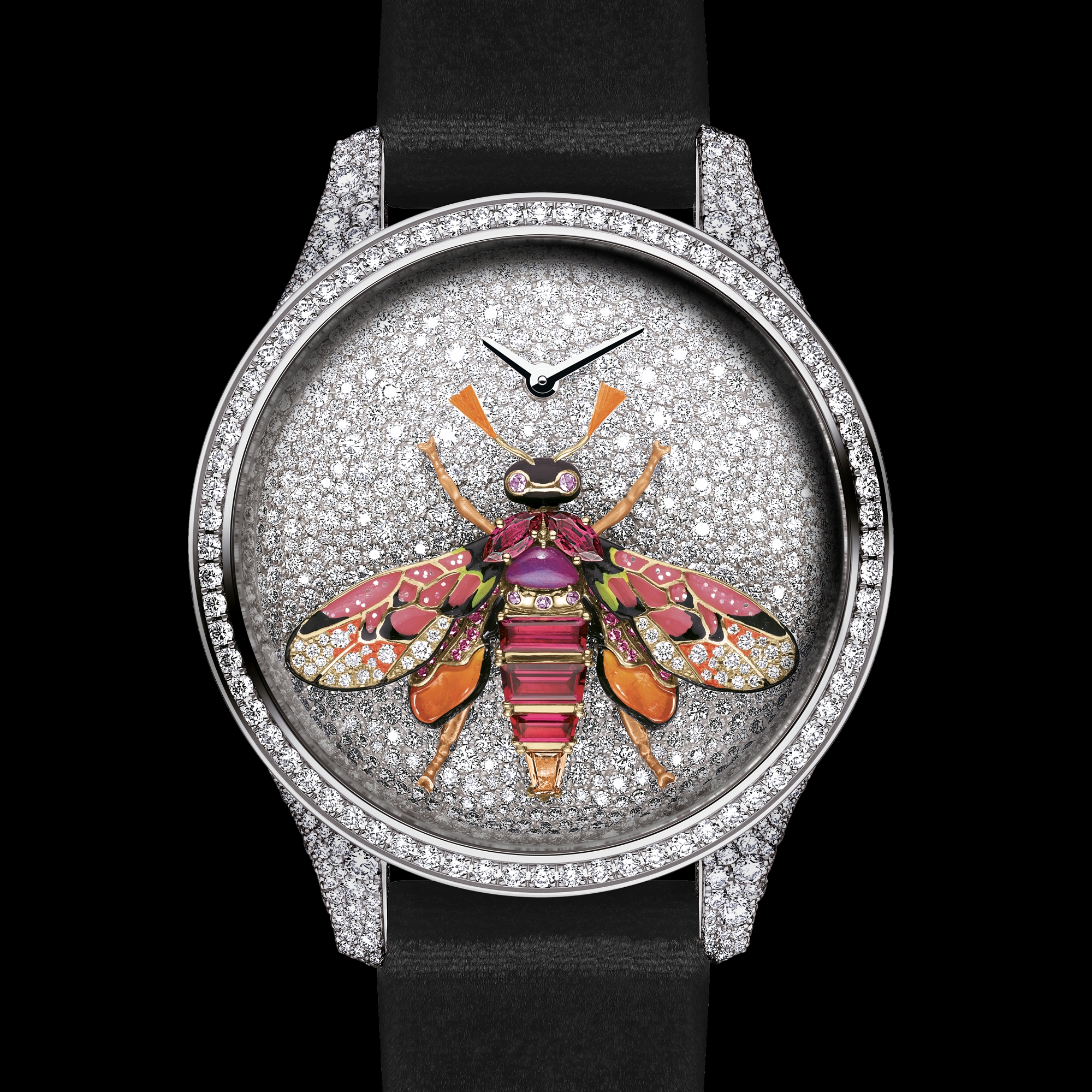 白色 18K 金表盘搭配雪花镶嵌圆形切割钻石,饰以玫瑰色 K 金小蜜蜂,镶嵌圆形切割、菱形切割和长阶梯形切割红宝石,长阶梯形切割石榴石,圆形切割紫水晶,