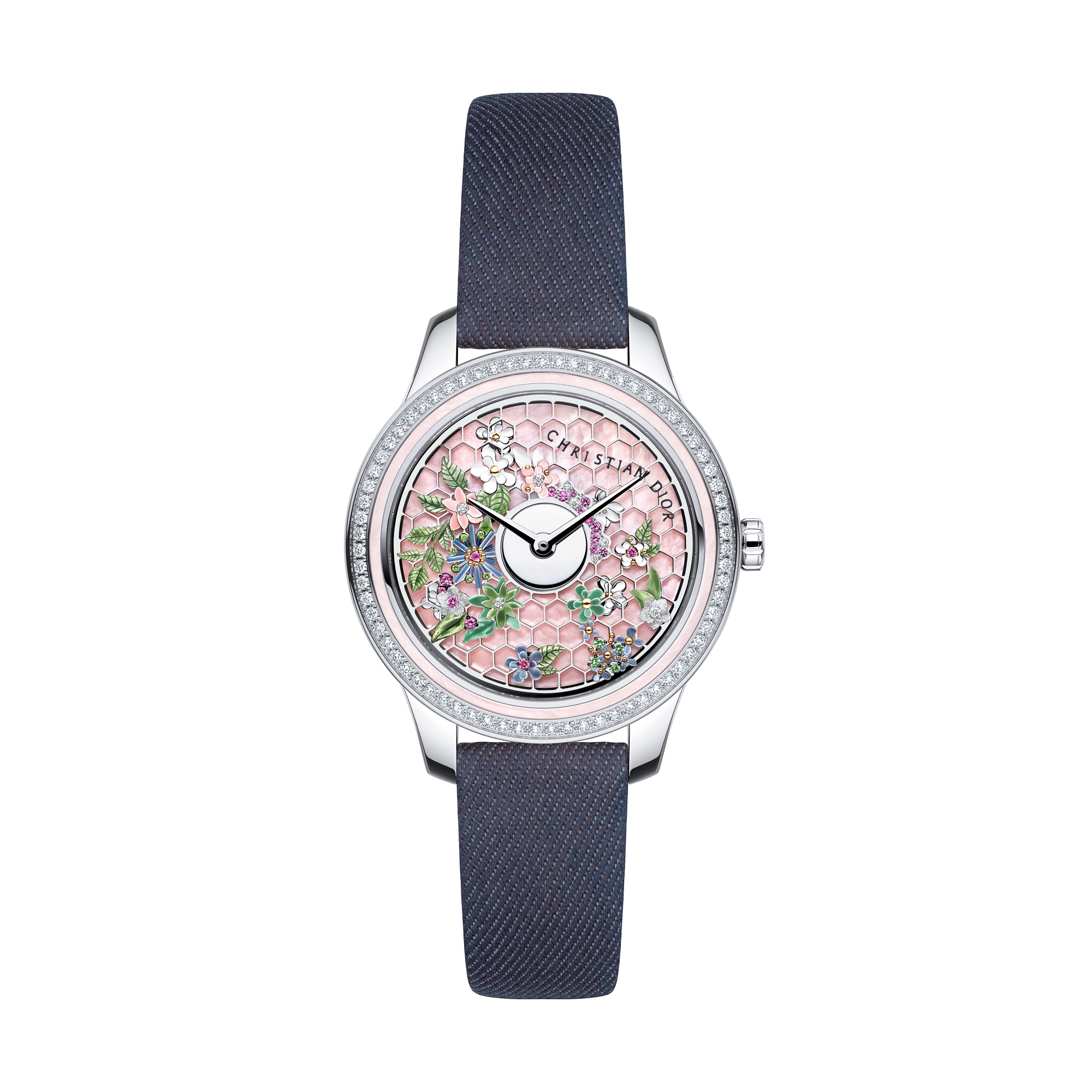 表盘一侧带有白色 18K 金和白金镂空摆轮,饰以富有纹理的涂漆花朵,镶嵌 8 颗明亮式切割钻石(0.02 克拉*),17 颗明亮式切割粉色蓝宝石(0.08 克拉*)和 10 颗明亮式切割沙弗莱石(0.03 克拉*)