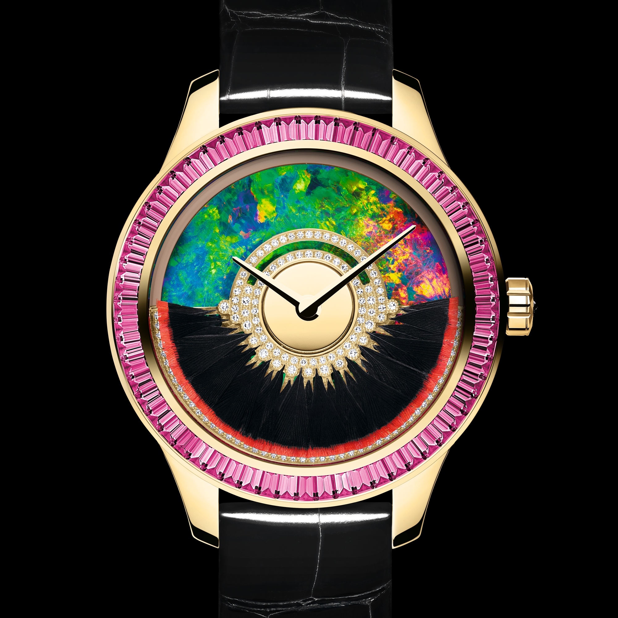 表盘侧面带有黄色 18K 金 360° 功能型摆轮,镶嵌 131 颗圆形切割钻石(0.17 克拉*),以羽毛装饰