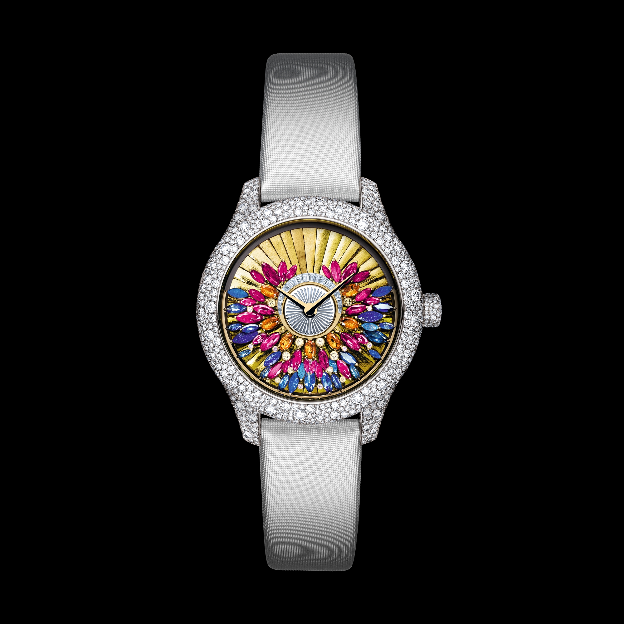 36 毫米白色 K 金表壳,密镶以雪花镶嵌明亮式切割钻石,白色 K 金表圈密镶以明亮式切割钻石,表圈边缘镶嵌以明亮式切割钻石,白色 K 金表冠密镶以雪花镶嵌明亮式切割钻石、表后盖饰以粉色至黄色渐变蓝宝石玻璃。