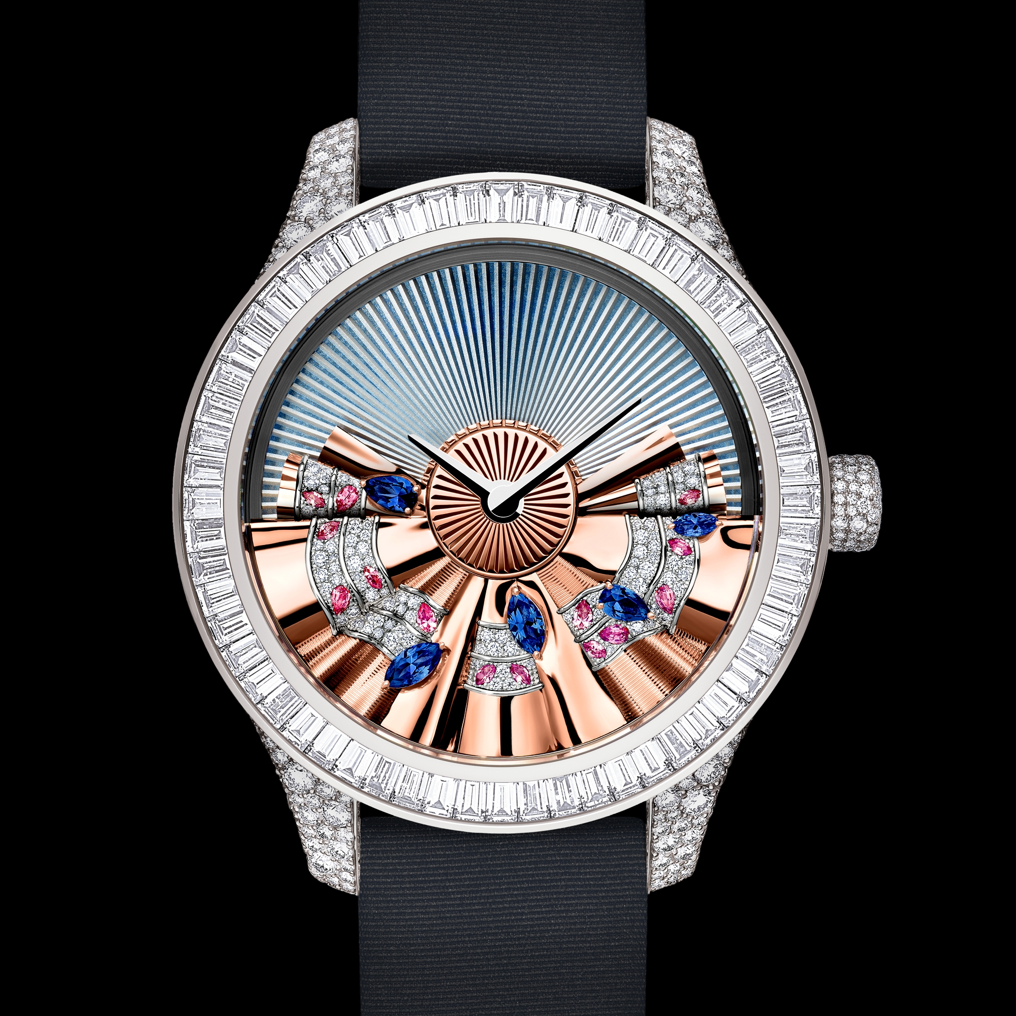 表盘一侧带有白色和玫瑰色 18K 金功能型摆轮,镶嵌以明亮式切割钻石、菱形切割和梨形切割蓝宝石、菱形切割和梨形切割粉色蓝宝石以及菱形切割锰铝榴石。