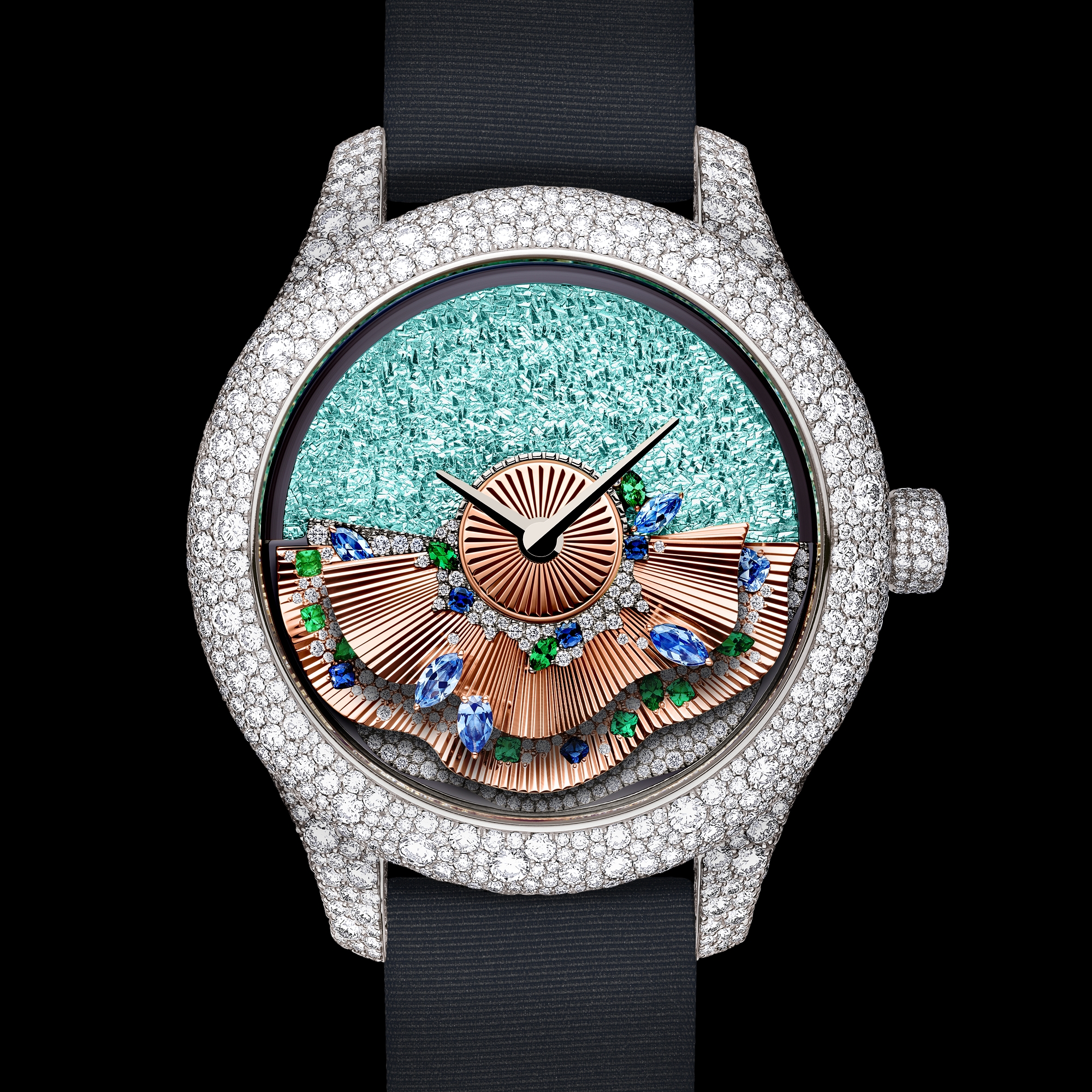 Dior Grand Bal 系列采用金色丝线、网眼织物、桑蚕丝、羽毛和石饰以及甲虫翅膀装饰,宛如 Dior 高级订制时装工坊采用缎面、罗缎和塔夫绸面料精心打造华美礼服,突显丰富的层次感。如今运用制表工艺科技创新,来彰显女性魅力。精致的材质和万花筒般绚丽的色彩,令人想起 Dior 先生钟爱的梦幻舞会,吸引着盛装出席的舞者在舞池中流连忘返。