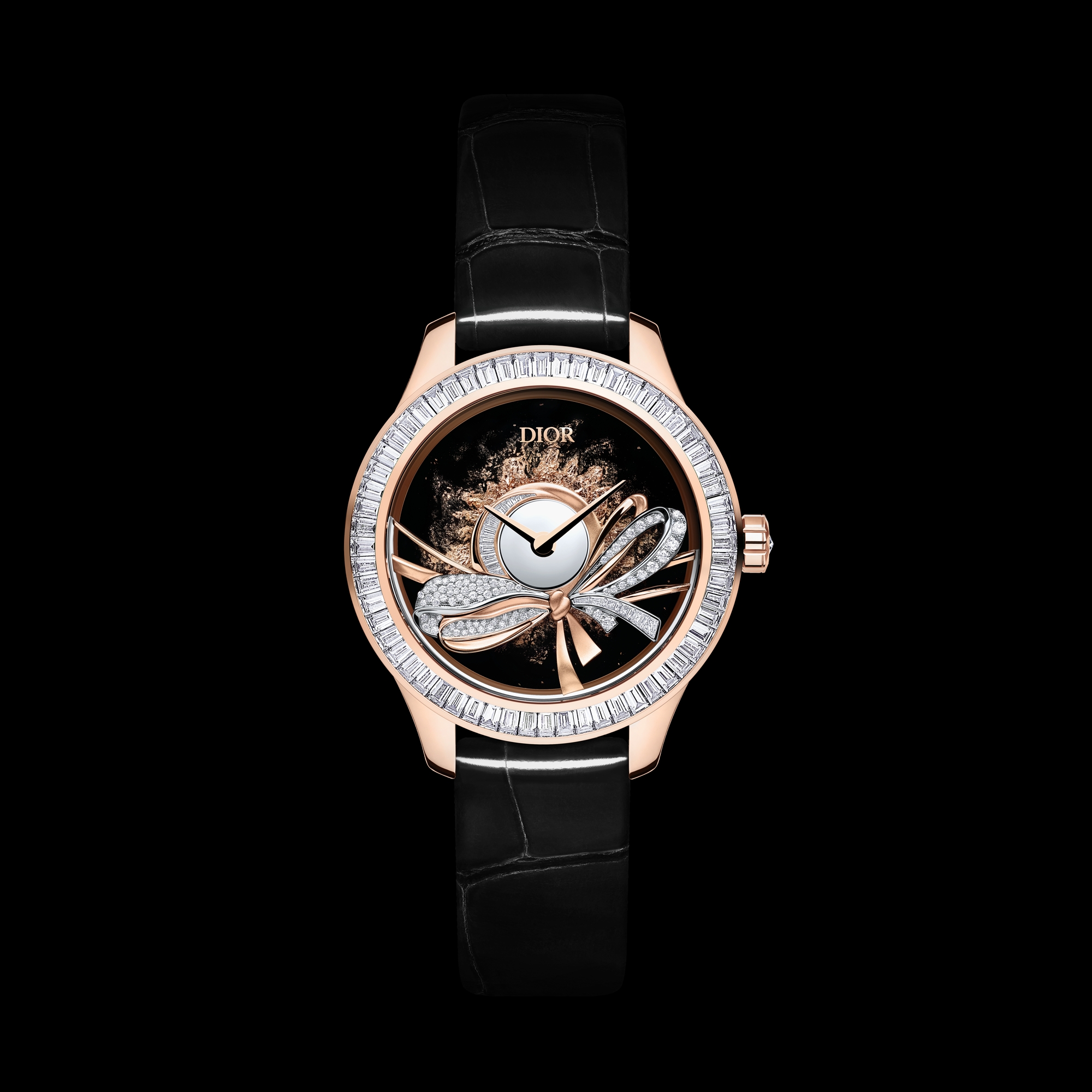 黑色鳄鱼皮革表带,搭配玫瑰色 K 金针扣,镶嵌明亮式切割钻石。