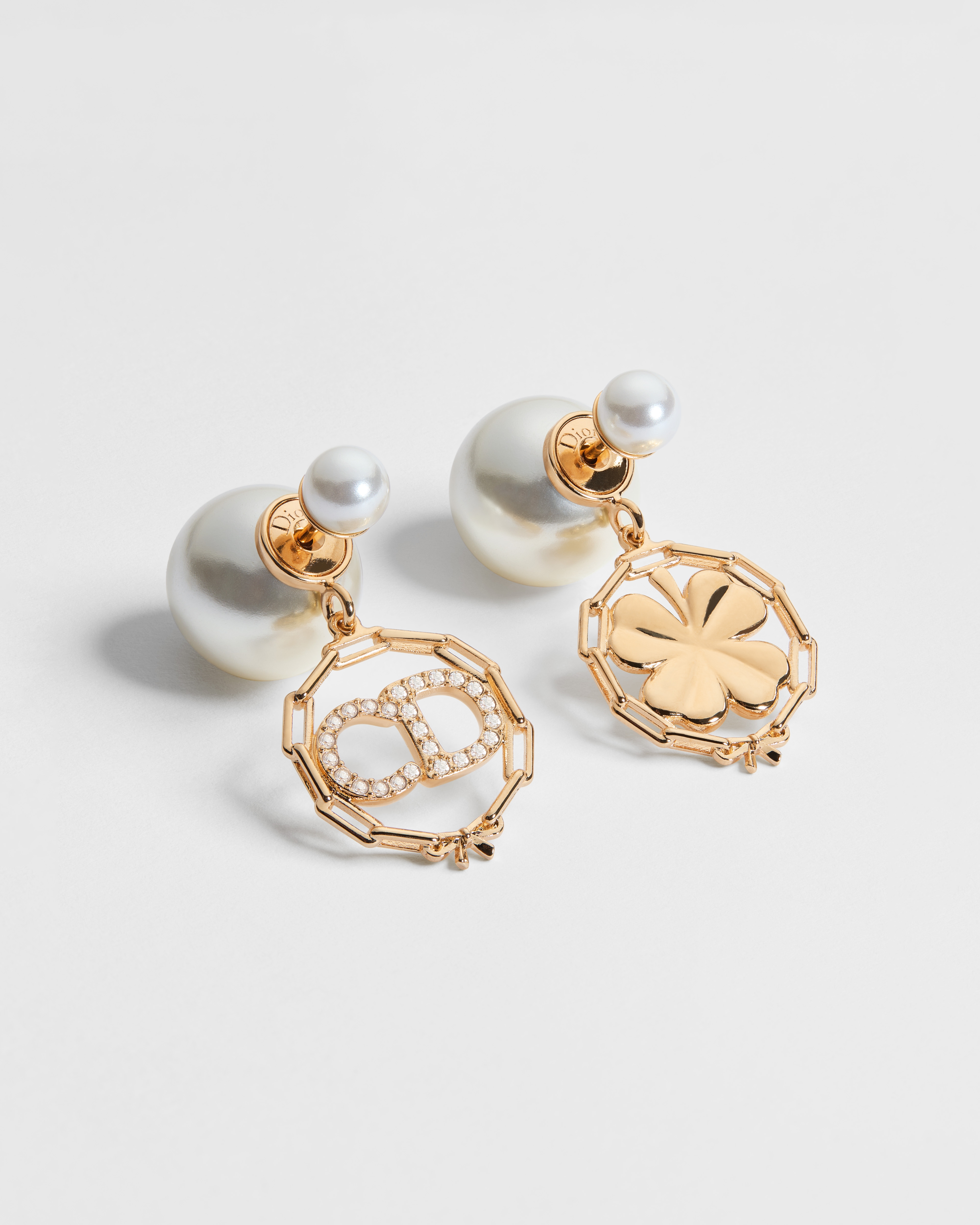 这款 Dior Tribales 耳环灵感源自 Dior 皮革制品,彰显优雅的现代风格。经典的树脂珠饰,一侧突显 CD 标志,密镶以晶体,另一侧饰以四叶草,两侧均搭配点缀以精美小蝴蝶结的链条边框。可与 CD Circle Chain 系列的单品搭配,打造整体造型。