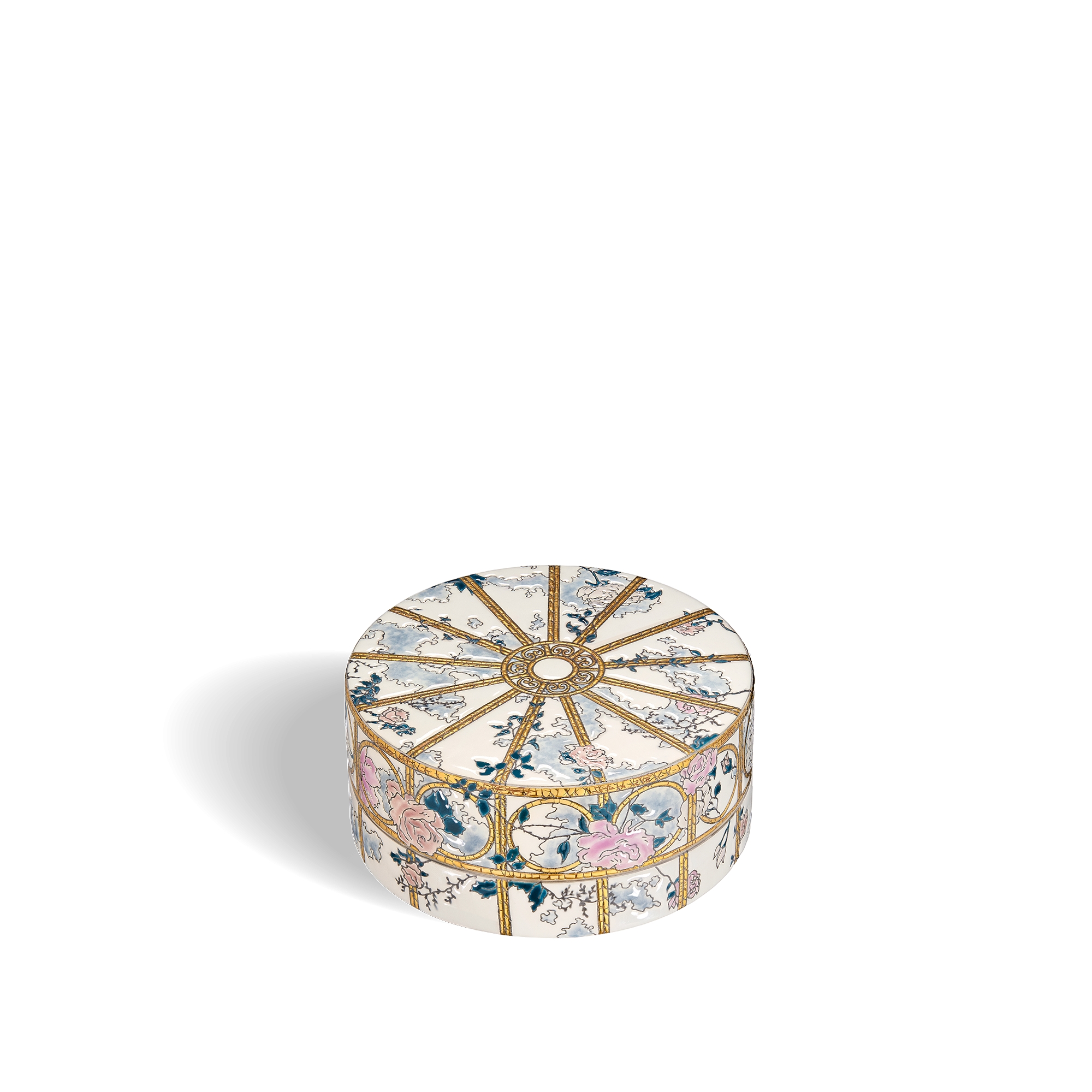 这款圆形盒子来自格兰维尔系列,该系列灵感源自 Les Rhumbs 别墅,致敬 Dior 先生童年的避风港。采用米白色陶瓷和瓷釉与 Manufacture des Émaux de Longwy* 联名手工打造,饰以金色调,彰显金色、粉色和蓝色色调的精致玫瑰,在冬日花园的铁艺结构上绽放。瓷釉工艺采用手工逐滴涂抹,操作非常精细,展现出非凡的工艺水准。款式别致,可为室内装饰增添诗意魅力,可与格兰维尔系列的其他单品搭配,营造精致的气氛。
