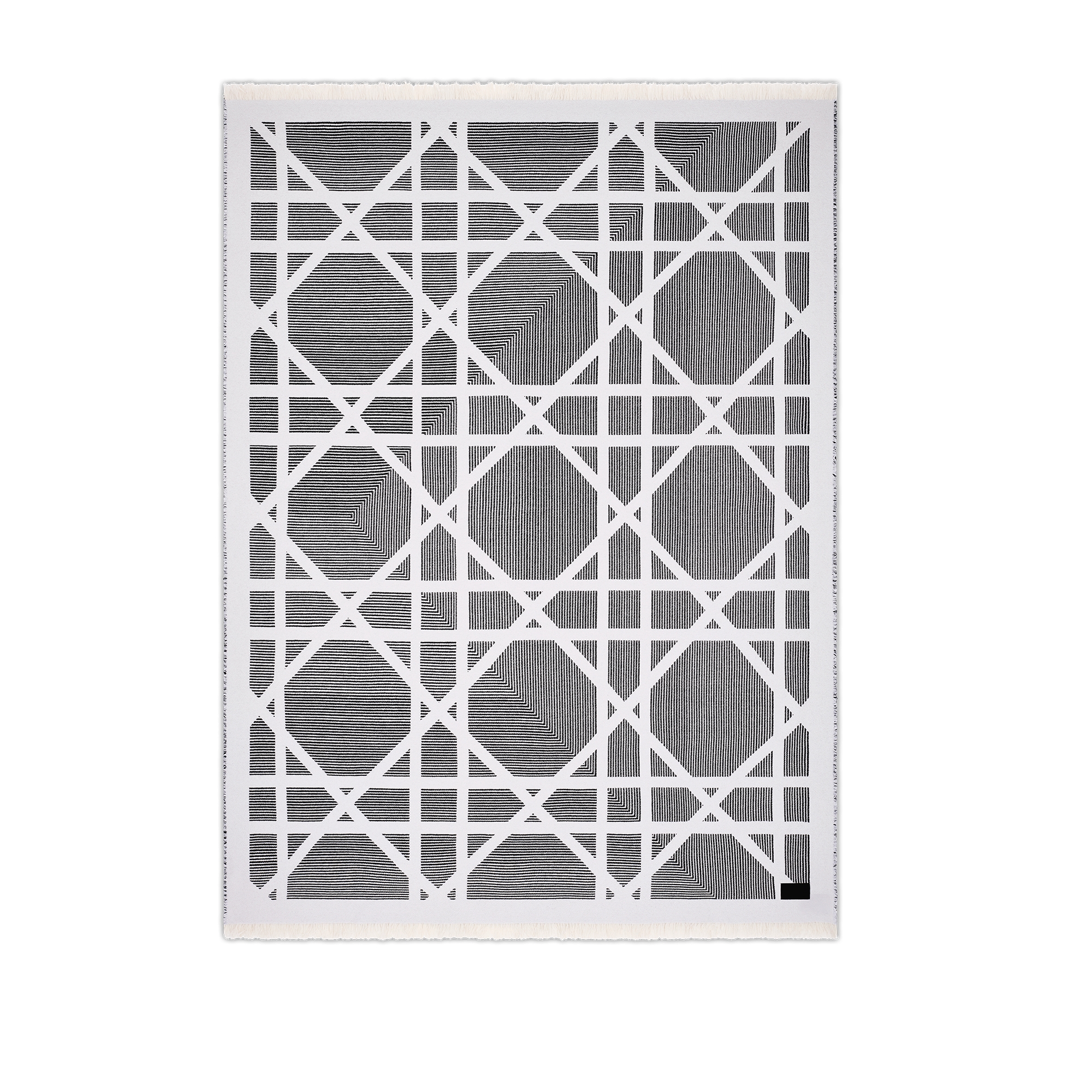 黑色和白色绵羊毛、山羊绒和桑蚕丝混纺提花面料 Optique 藤格纹