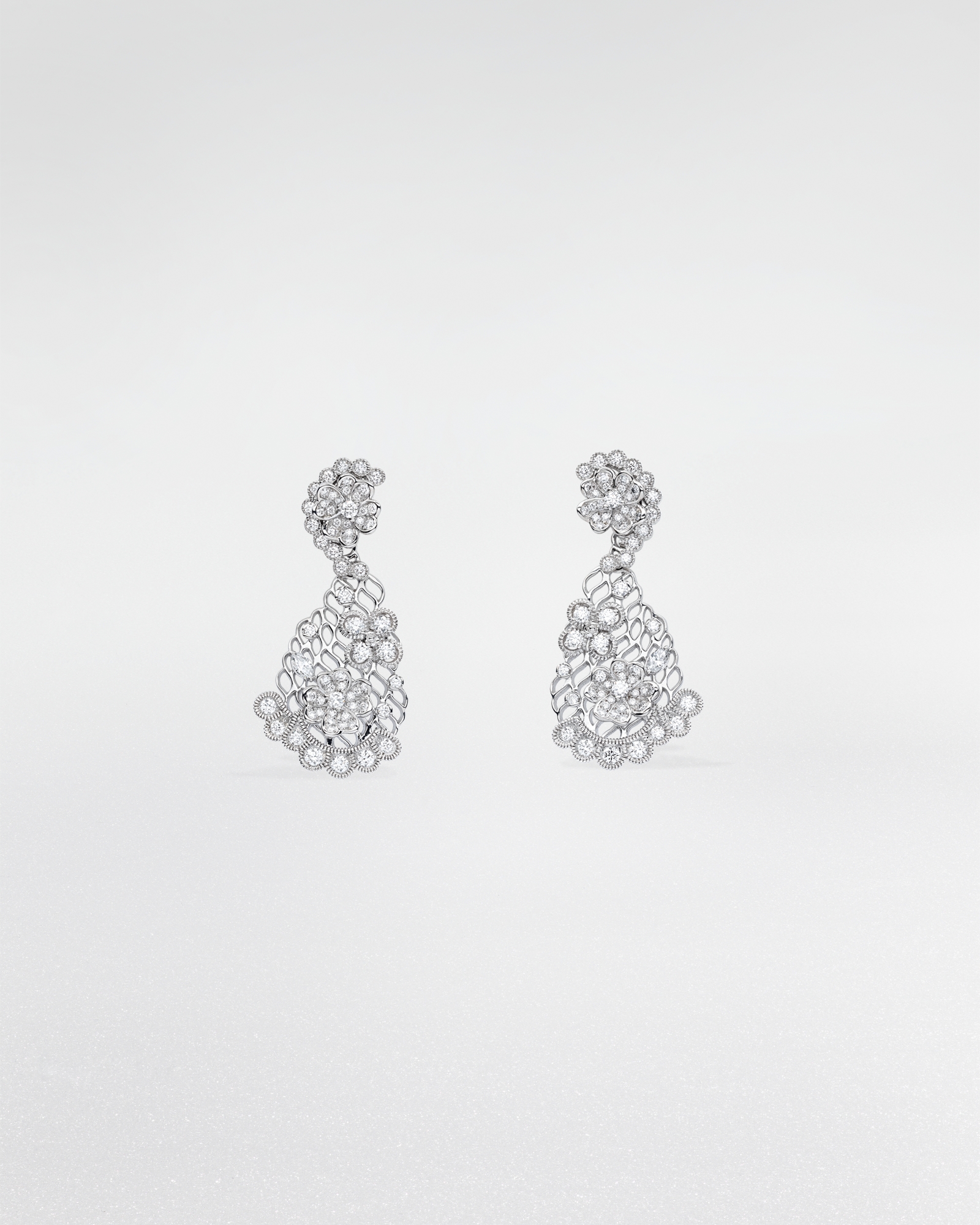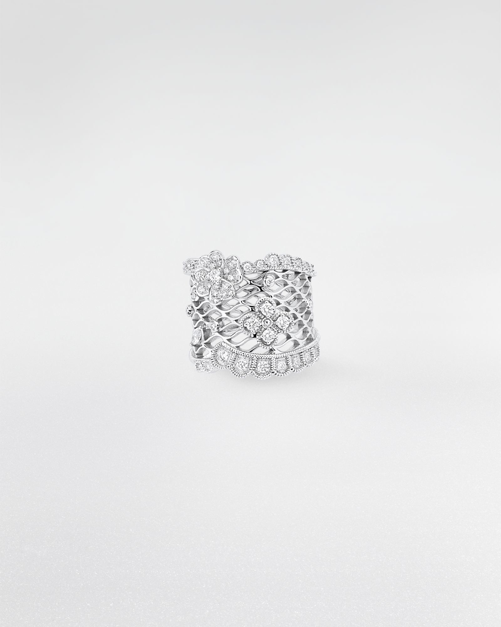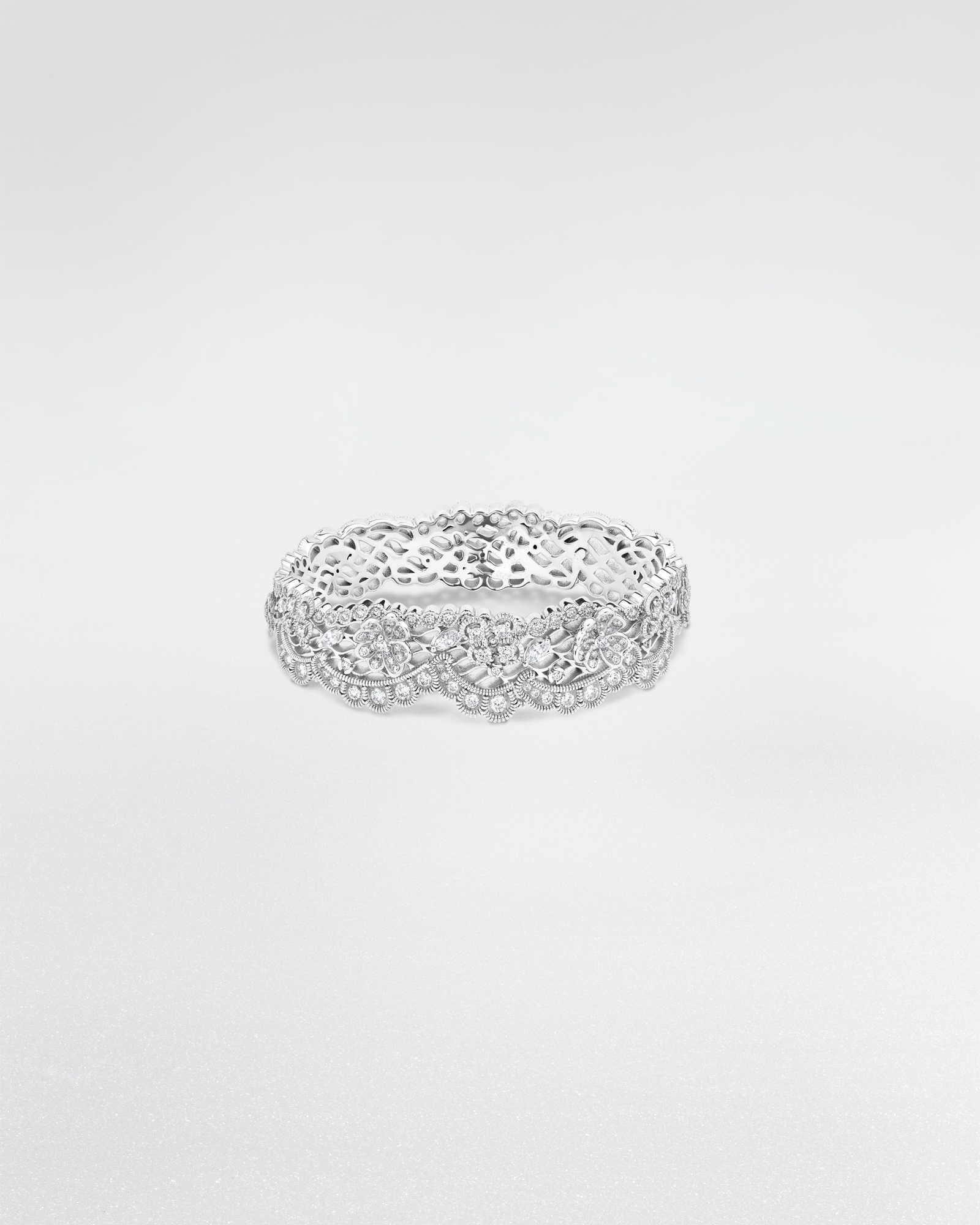 Couture Dior 系列以隽永珠宝传递 Dior 创意精神。从材质选择,到褶裥、垂褶与刺绣等工艺,种种制衣元素在精美珠宝中得以生动体现。这款单品出自维多利娅·德卡斯特兰 (Victoire de Castellane) 之手,和 Dior Dior Dior 高端珠宝系列一样,灵感源自蕾丝花边。
