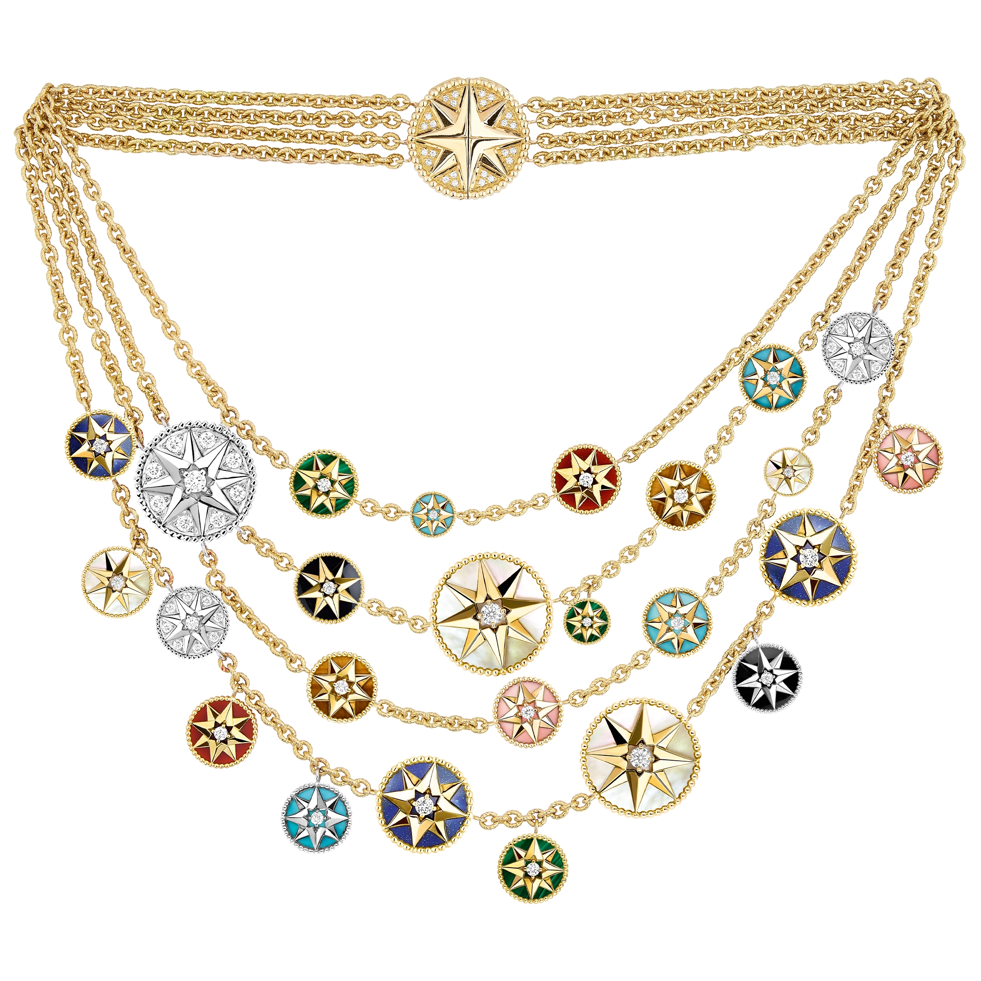 珍珠母贝、青金石、孔雀石、绿松石、缟玛瑙、虎眼石、红玉髓和粉色欧泊装饰