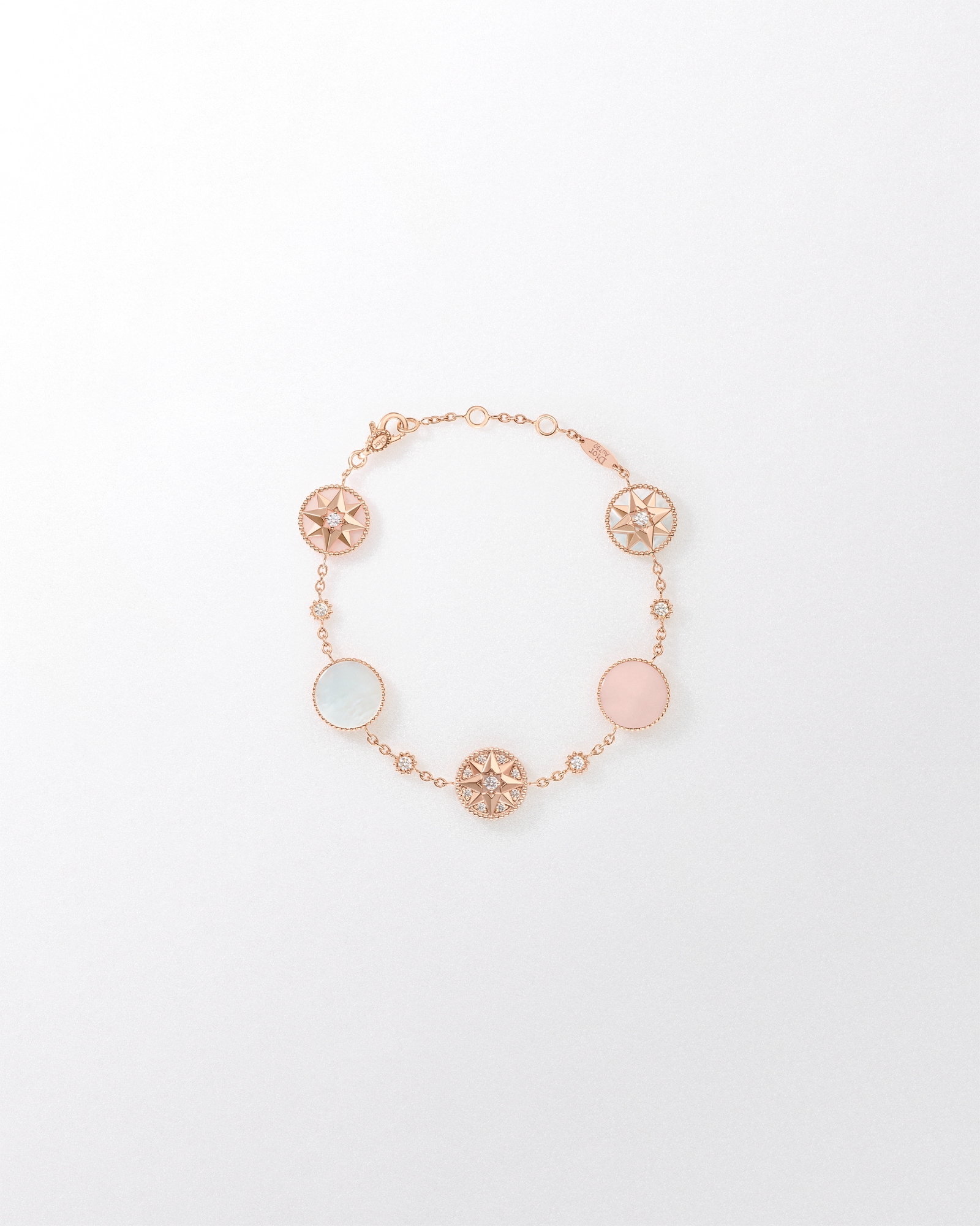 这款手链款式优雅,为 Rose des Vents 图案带来柔和温暖的色彩。双面设计,一面点缀以粉色欧泊和珍珠母贝提升格调,另一面突显中间密镶图案,饰以雪花镶嵌的璀璨钻石。可与其他 Rose des Vents 单品轻松搭配。