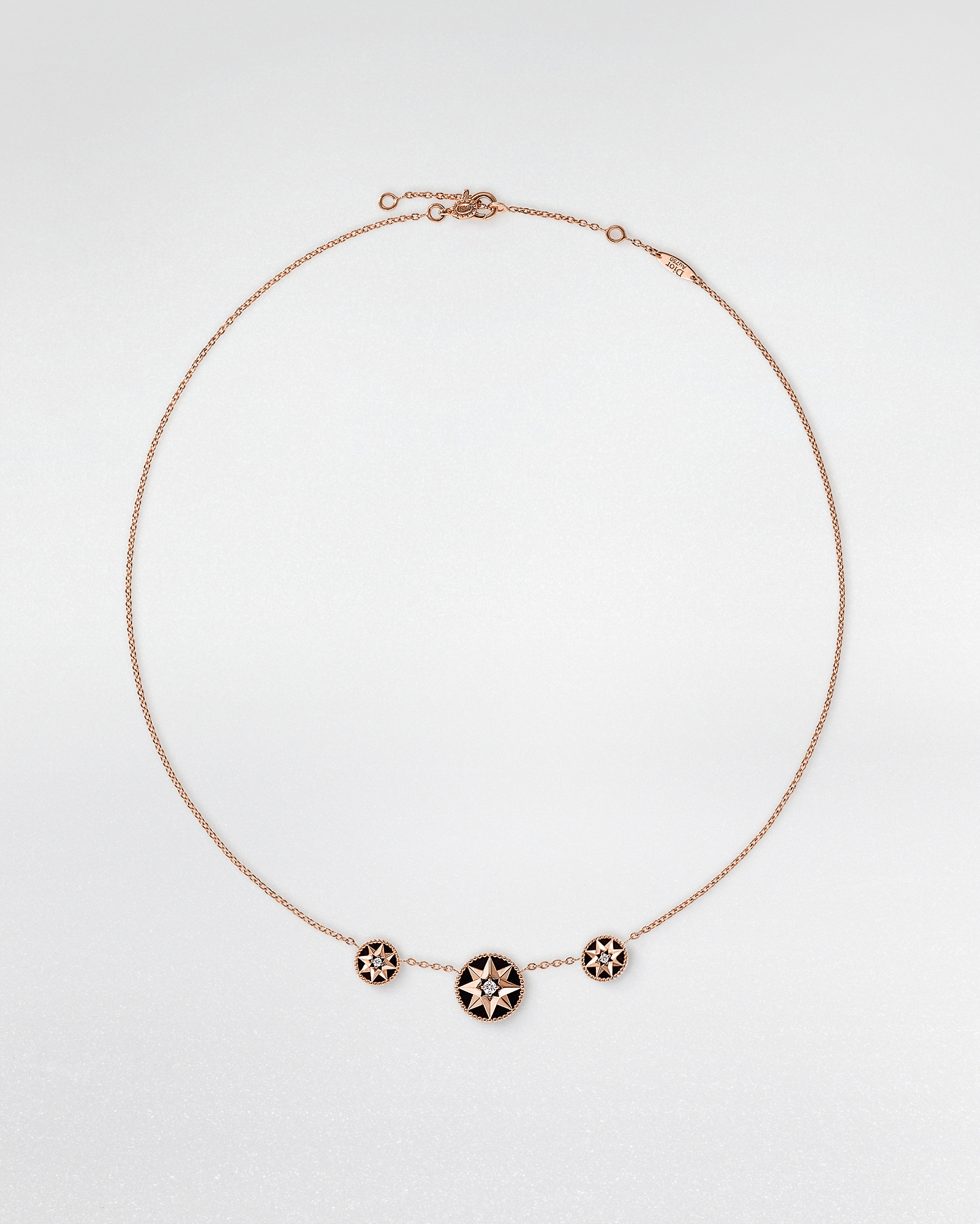 这款项链以浓烈黑色缟玛瑙为特色,精心点缀以大小不一的图案,打造优雅精致的廓形。缟玛瑙被视为具有保护寓意的宝石,为这款单品赋予珍贵且具有象征意义的特质。可与 Rose des Vents 系列的其他单品轻松搭配。