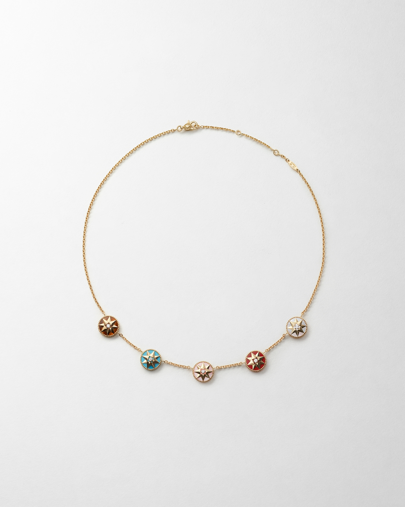 Rose des Vents 项链采用全新配色,璀璨耀眼,搭配五种图案,打造黄色 18K 金版本。明亮而精致的设计,突显宝石的光彩,彰显活泼时尚的美感。