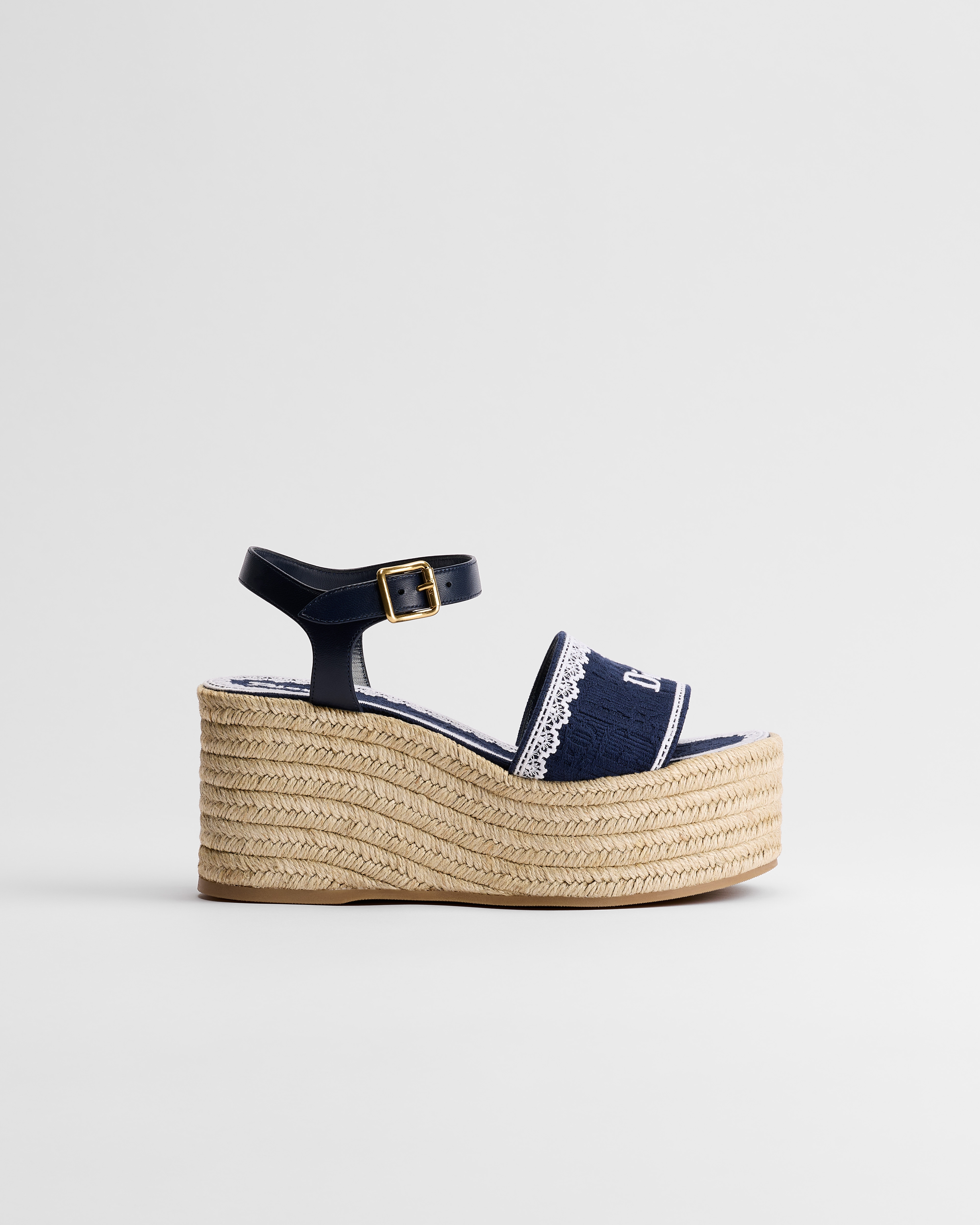 这款 Dior Dentelle 坡跟凉鞋由乔纳森·安德森 (Jonathan Anderson) 为 Dior 倾情设计,以时尚风范全新演绎 Dior 优雅的经典标识。流畅廓形,采用海军蓝色棉质面料精心制作,饰以 Oblique 印花和白色蕾丝,可调节同色调羊皮革系带搭配搭扣,精巧装饰脚踝。搭配传统工艺手工制作的 8 厘米绳编坡跟,可为本季各式造型提升格调。