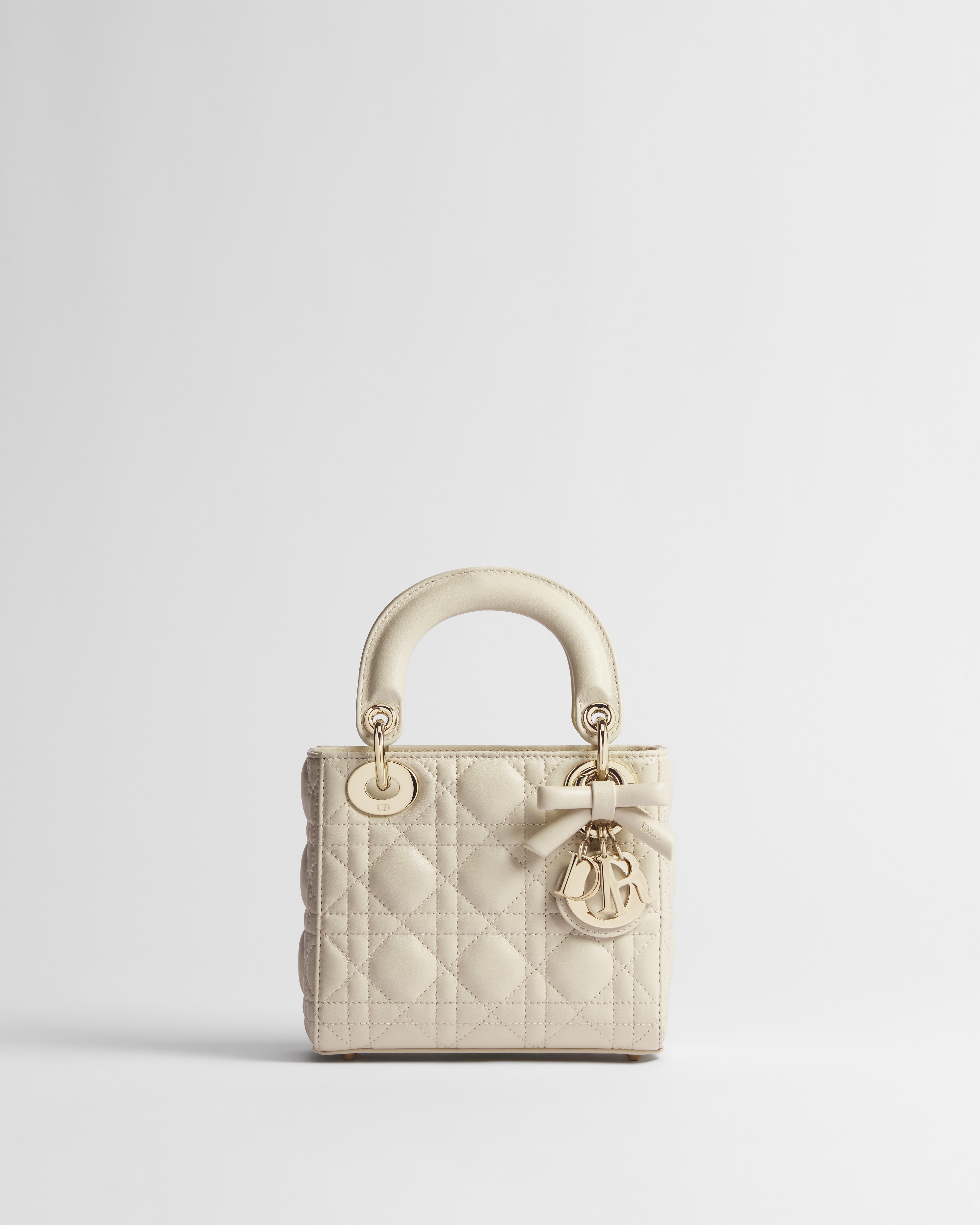 这款 Lady Dior 手袋以乔纳森·安德森 (Jonathan Anderson) 的艺术创意重新诠释。浅金色饰面金属 D.I.O.R. 吊饰搭配可拆卸的粉笔米白 (Craie) 皮革蝴蝶结提升格调。迷你款式,搭配可拆卸链条肩带,可手提彰显隽永优雅格调,或斜挎打造时髦造型。