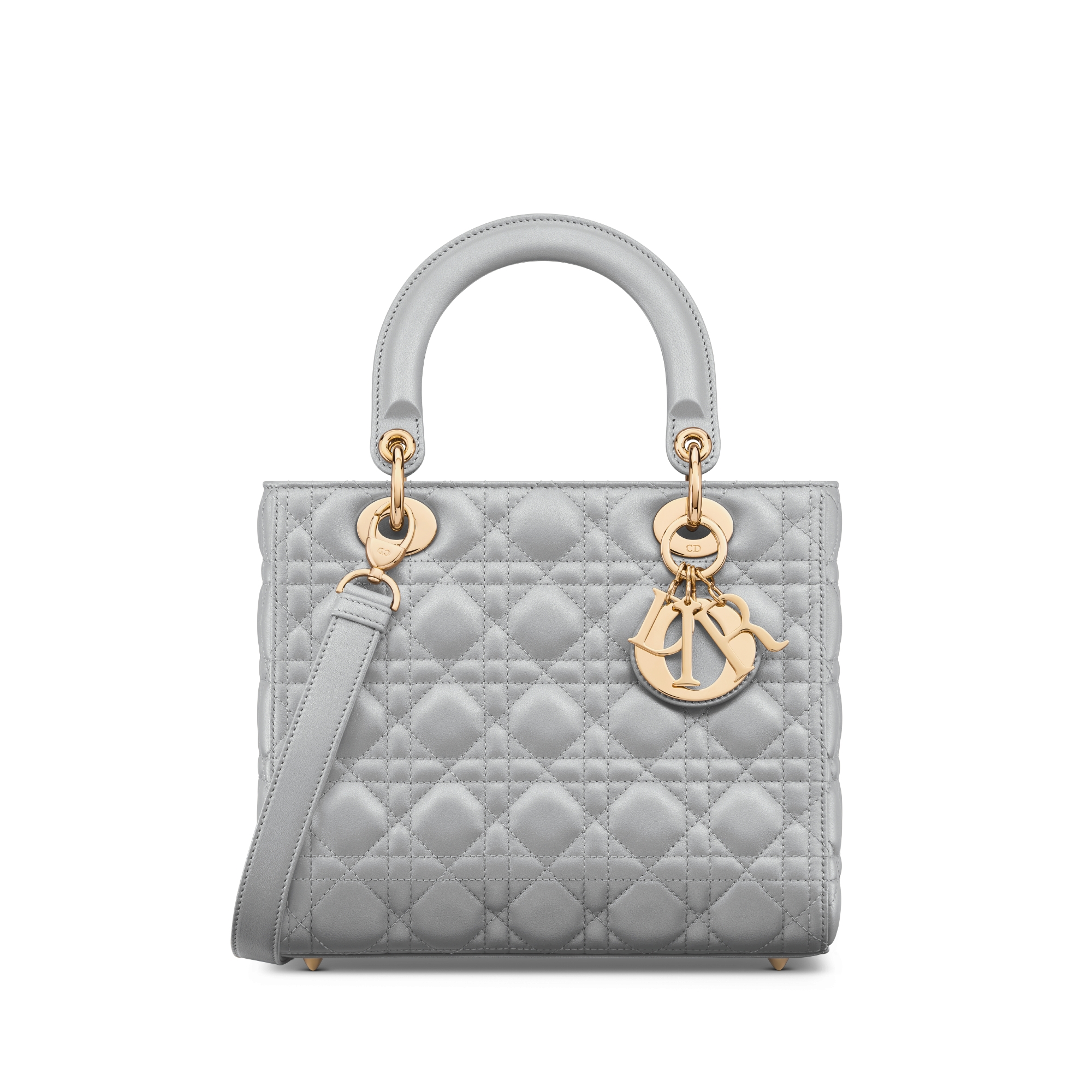 这款 Lady Dior 手袋集中体现了 Dior 对优雅和美丽的深刻洞见。时髦典雅的设计经久不衰。采用灰乳白色珠光羊皮革精心制作,饰以藤格纹缉面线,绗缝纹理醒目吸睛。搭配浅金色饰面金属 D.I.O.R. 吊饰,为精美的轮廓增添一分灵动。中号款式,搭配可拆卸的细皮革肩带,可手提或斜挎。