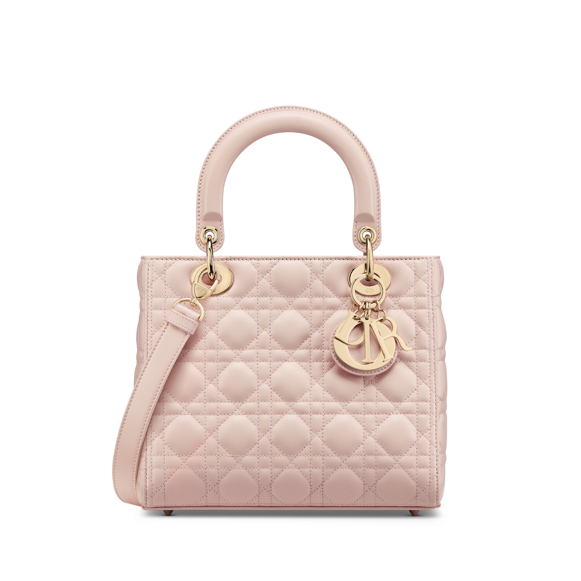 这款 Lady Dior 手袋集中体现了 Dior 对优雅和美丽的深刻洞见。时髦典雅的设计经久不衰。采用胭脂粉色羊皮革精心制作,饰以藤格纹缉面线,绗缝纹理醒目吸睛。浅金色饰面金属 D.I.O.R. 吊饰彰显优雅气质。中号款式,搭配可拆卸的皮革细肩带,可手提或斜挎。