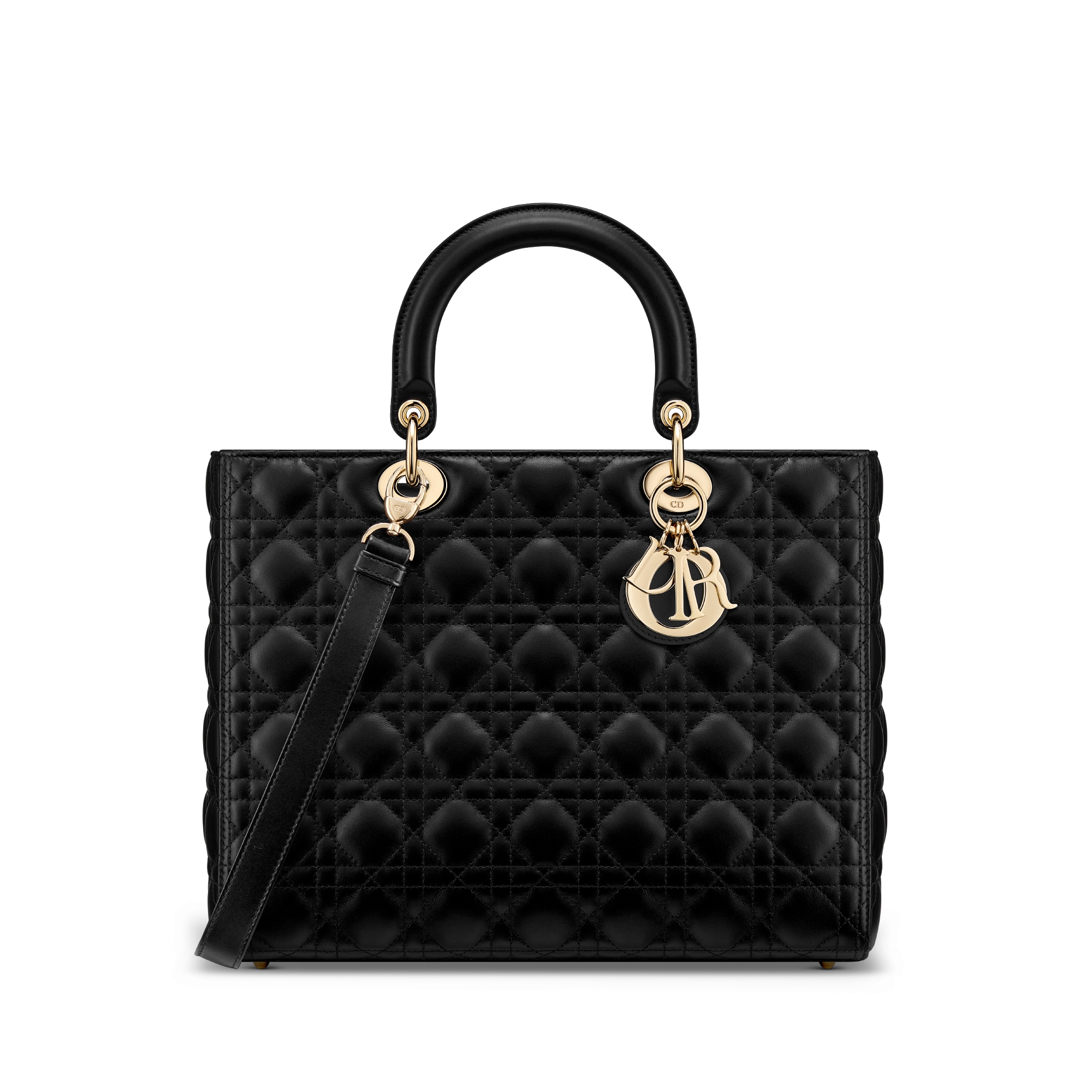 这款 Lady Dior 手袋集中体现了 Dior 对优雅和美丽的深刻洞见。采用黑色羊皮革精心制作,以藤格纹缉面线打造醒目的绗缝细节,时髦典雅的时尚设计经久不衰。缀有浅金色饰面金属 D.I.O.R. 吊饰,彰显优雅气质。大号款式,搭配可拆卸的皮革细肩带,可手提、肩背或斜挎。