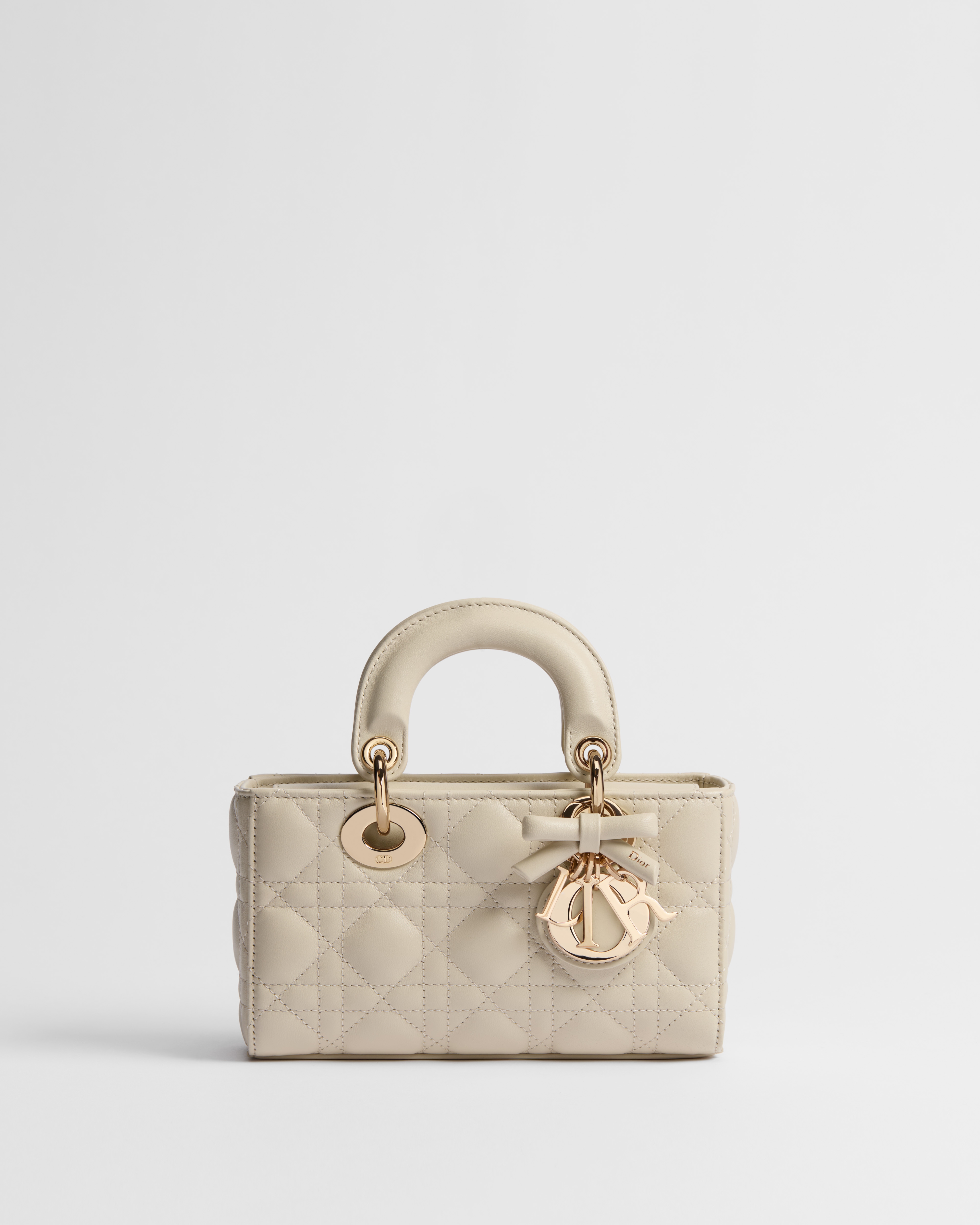 这款 Lady D-Joy 手袋凸显 Lady Dior 系列的简约美学,集中体现了 Dior 对优雅和美丽的深刻洞见。设计高雅经典,采用粉笔米白 (Craie) 羊皮革精心制作,饰以藤格纹缉面线,搭配浅金色饰面金属 D.I.O.R. 吊饰,点缀以可拆卸的皮革蝴蝶结提升格调。迷你款式,搭配可拆卸的链条肩带和可调节、可拆卸的皮革肩带,可手提、肩背或斜挎,是日常良伴。