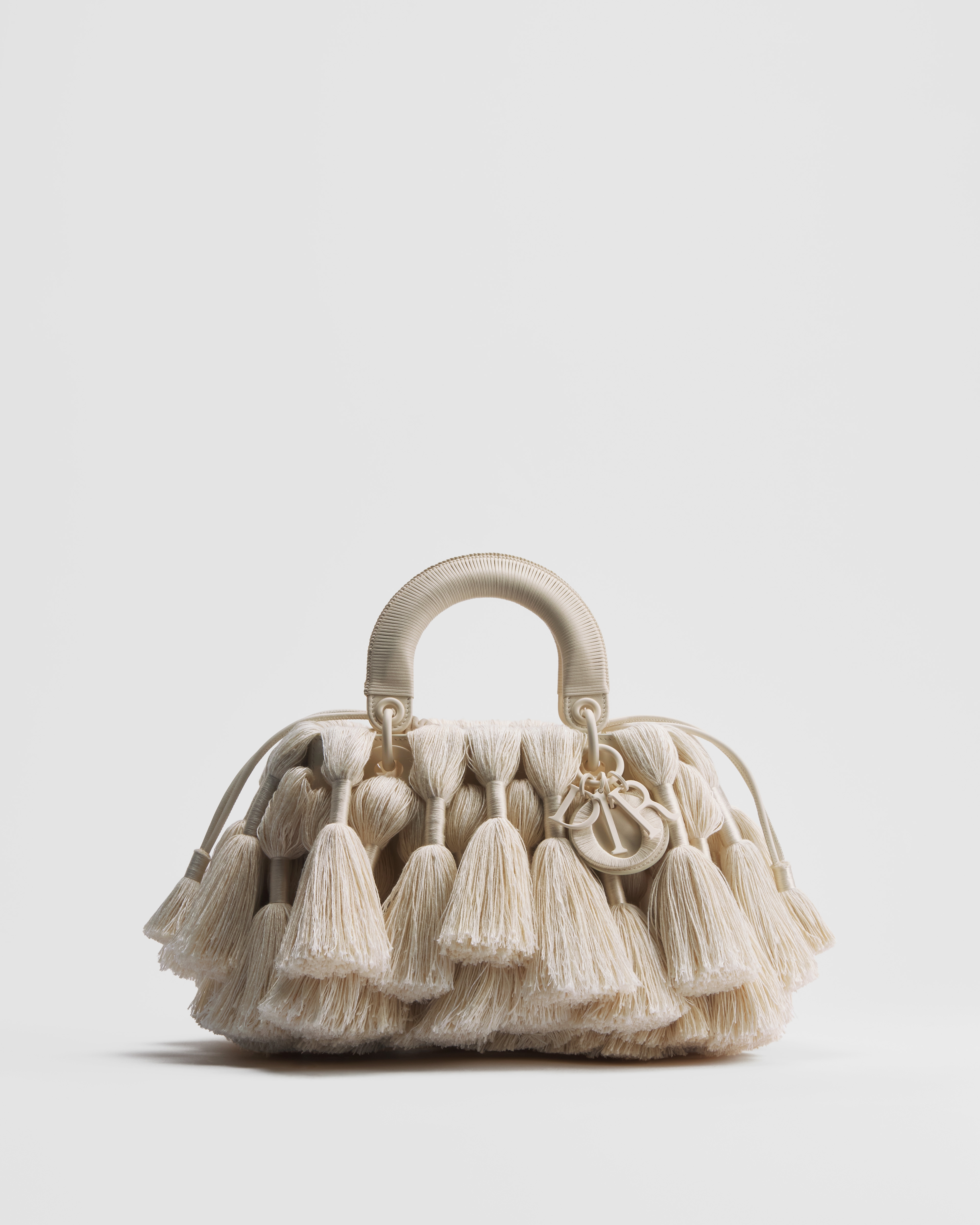 这款经典的 Lady Dior 手袋由纺织艺术家 Sheila Hicks 重新演绎,礼赞新生。饰以桑蚕丝和亚麻流苏,蓬松灵动,优雅别致,彰显 Dior 非凡的精湛工艺。带有机织顶部手柄和同色调 D.I.O.R. 吊饰,其中字母 O 点缀以刺绣,彰显时尚风范。小号款式,可手提或斜挎。