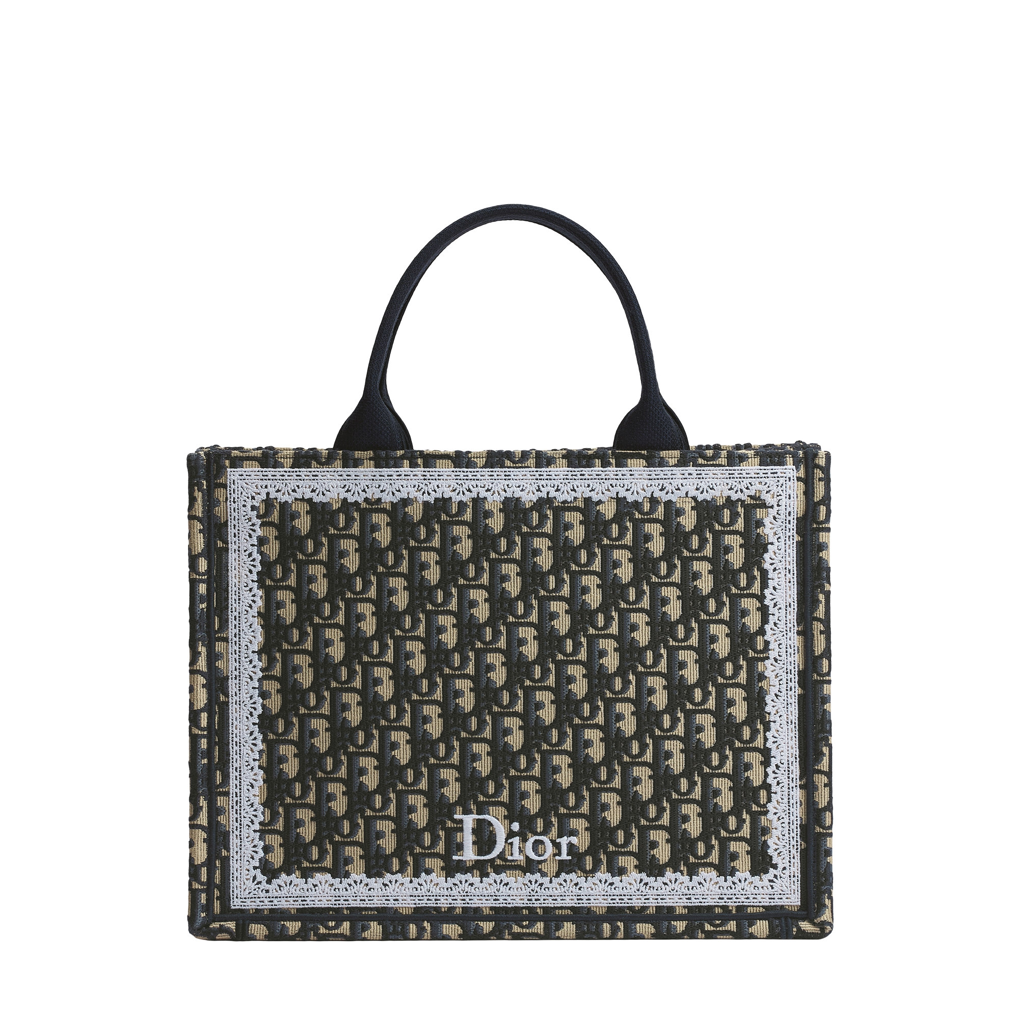 蓝色 Oblique 印花面料搭配白色蕾丝和 Dior Médaillon 标志(26.5 x 22 x 14 厘米)