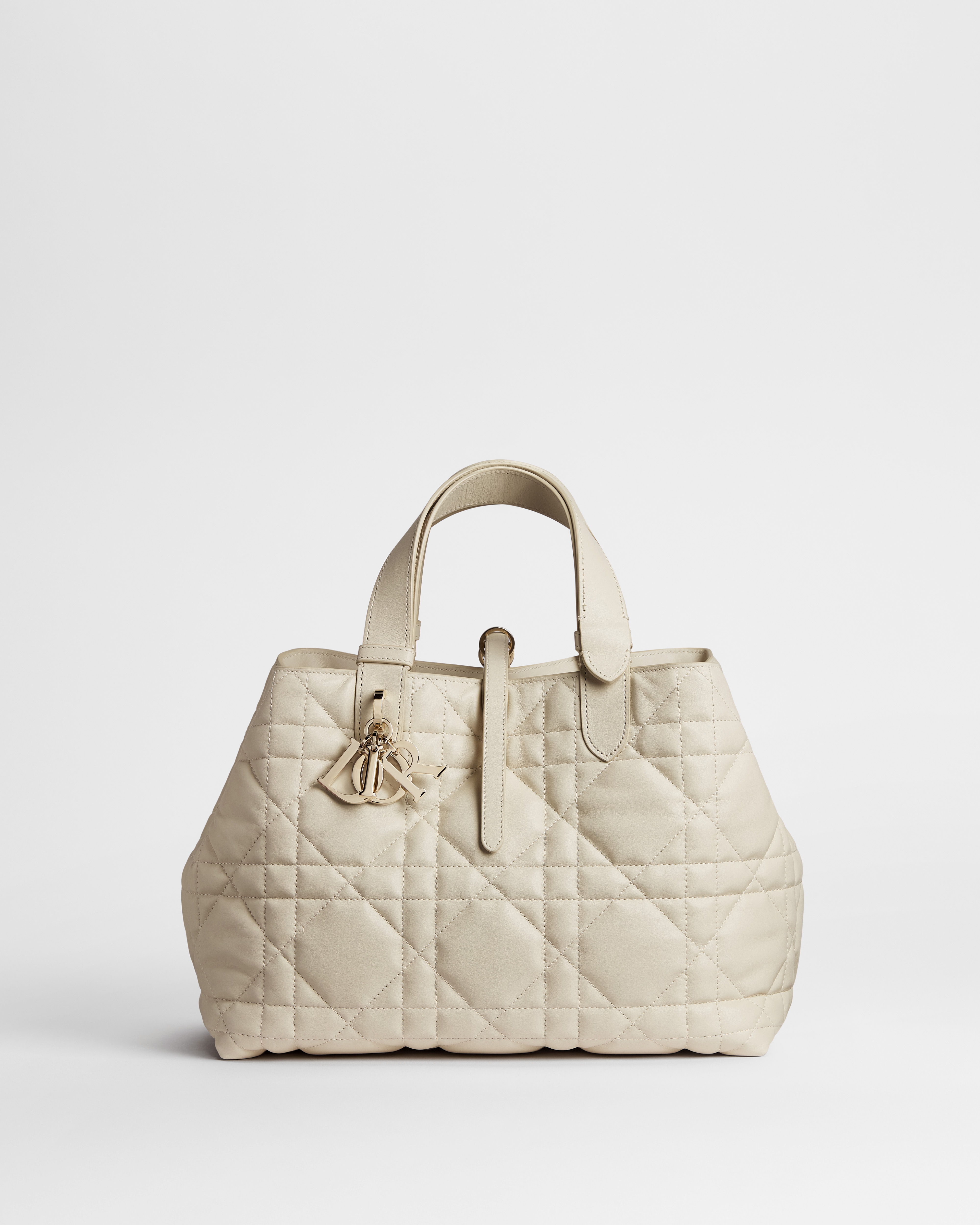 这款 Dior Toujours 手袋休闲实用,别具一格。采用粉笔米白 (Craie) 牛皮革精心制作,饰以超大藤格纹缉面线,宽敞的内部隔层搭配小袋,可整齐收纳各种日常用品。设有纤细皮革饰带开合,可安全收纳各种物品,另有 CD Lock 字母 D 旋钮式扣环,可调节两侧,彰显廓形。中号款式,皮革顶部手柄带有可调节细节,可手提或肩背。