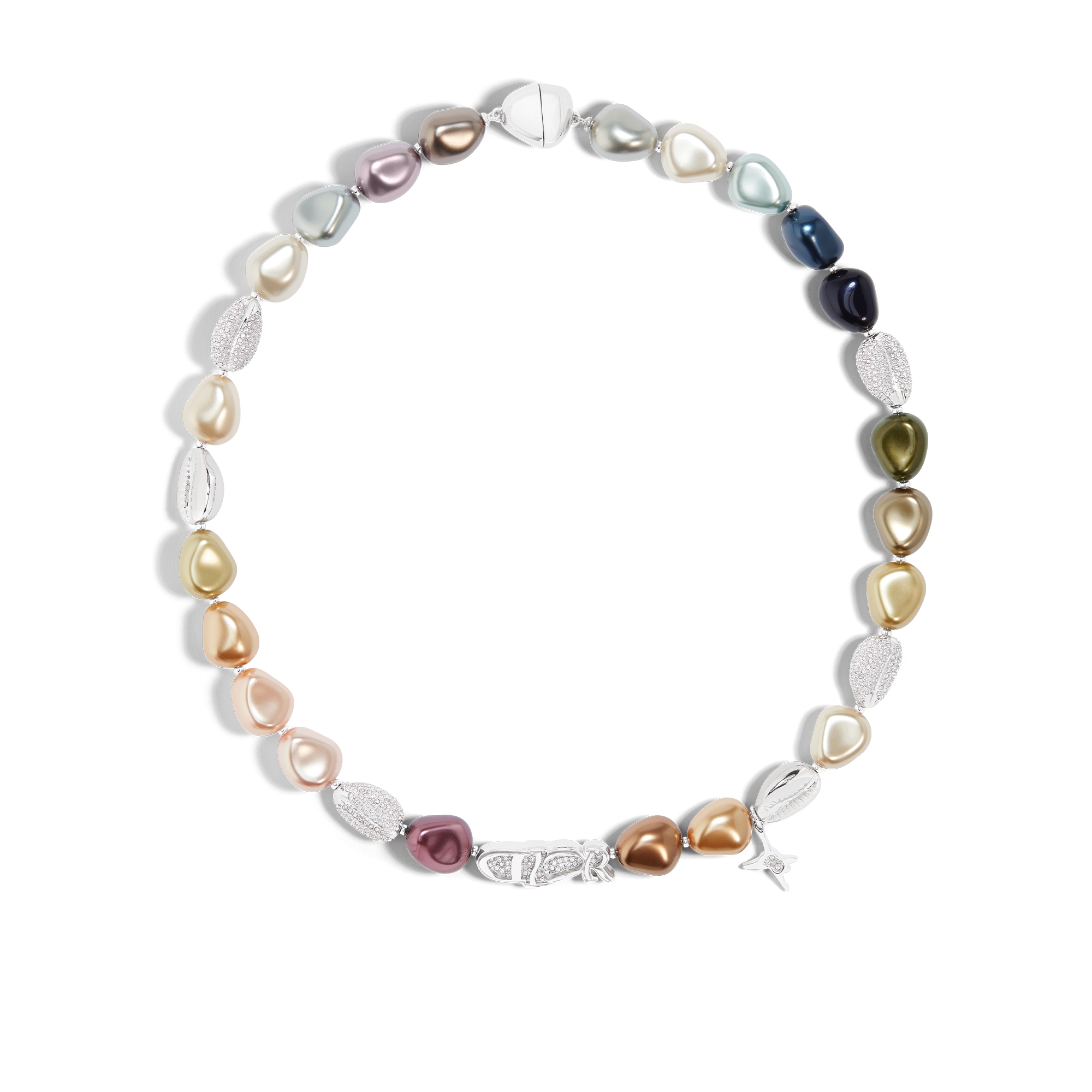 这款项链是二零二五春季男装系列新品,来自 DIOR AND LEWIS HAMILTON 限定系列。采用多色圆形仿水晶装饰精心制作,饰以 DIOR AND LEWIS HAMILTON 联名系列的贝壳和符号,点缀以银色饰面黄铜和白色仿水晶,以图形设计彰显 Dior 经典标志。可与限定系列的配套手链和戒指搭配,打造精致造型。