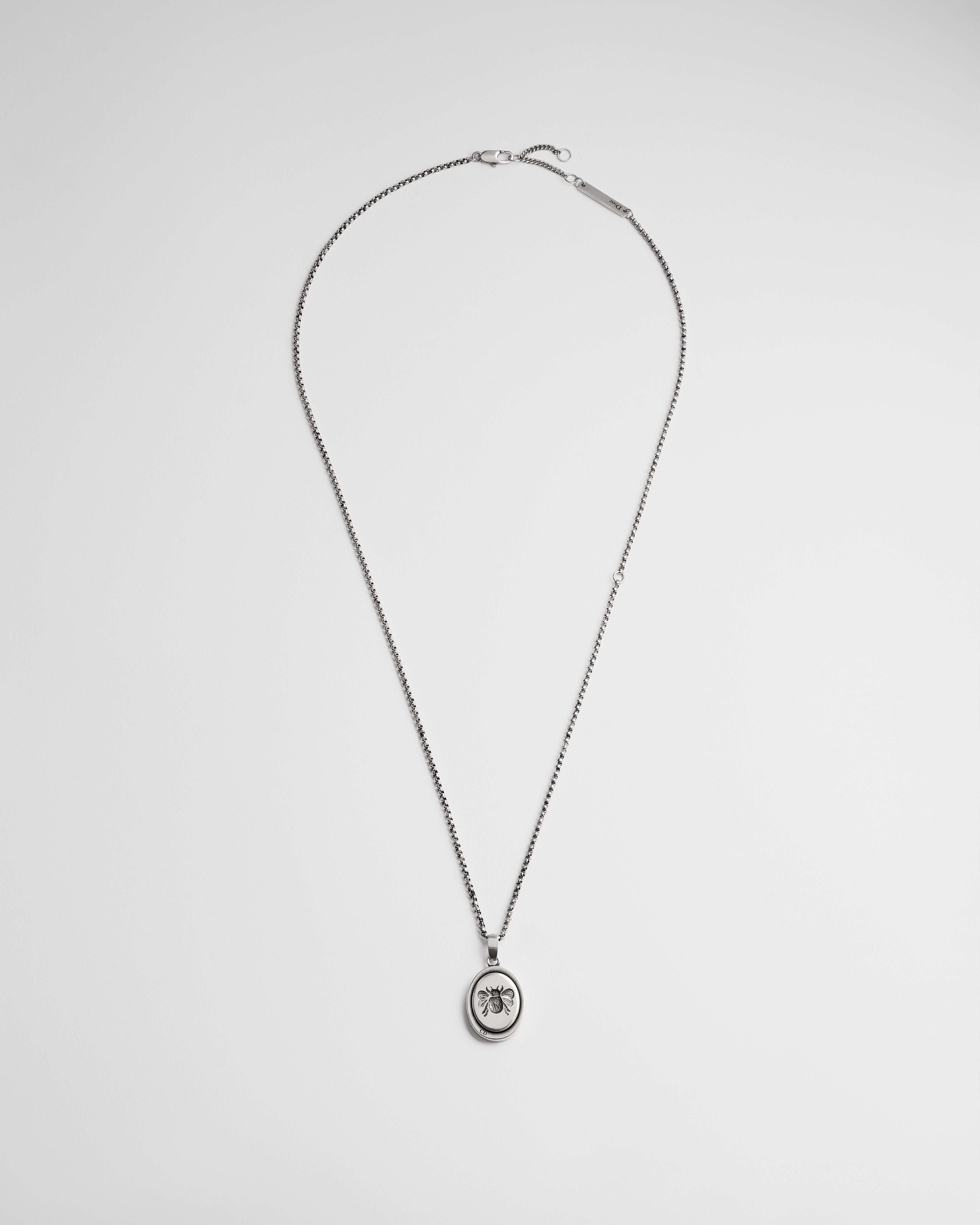 这款 Cameo Bee 项链是二零二六秋季男装系列新品,采用复古银色饰面铜合金精心制作,圆形饰牌镌刻有经典的小蜜蜂图案和 CD 标志。搭配可调节 Dior 金属饰牌扣环,可调节多种长度。可与该系列的其他 Cameo Bee 单品搭配,打造精致造型。
