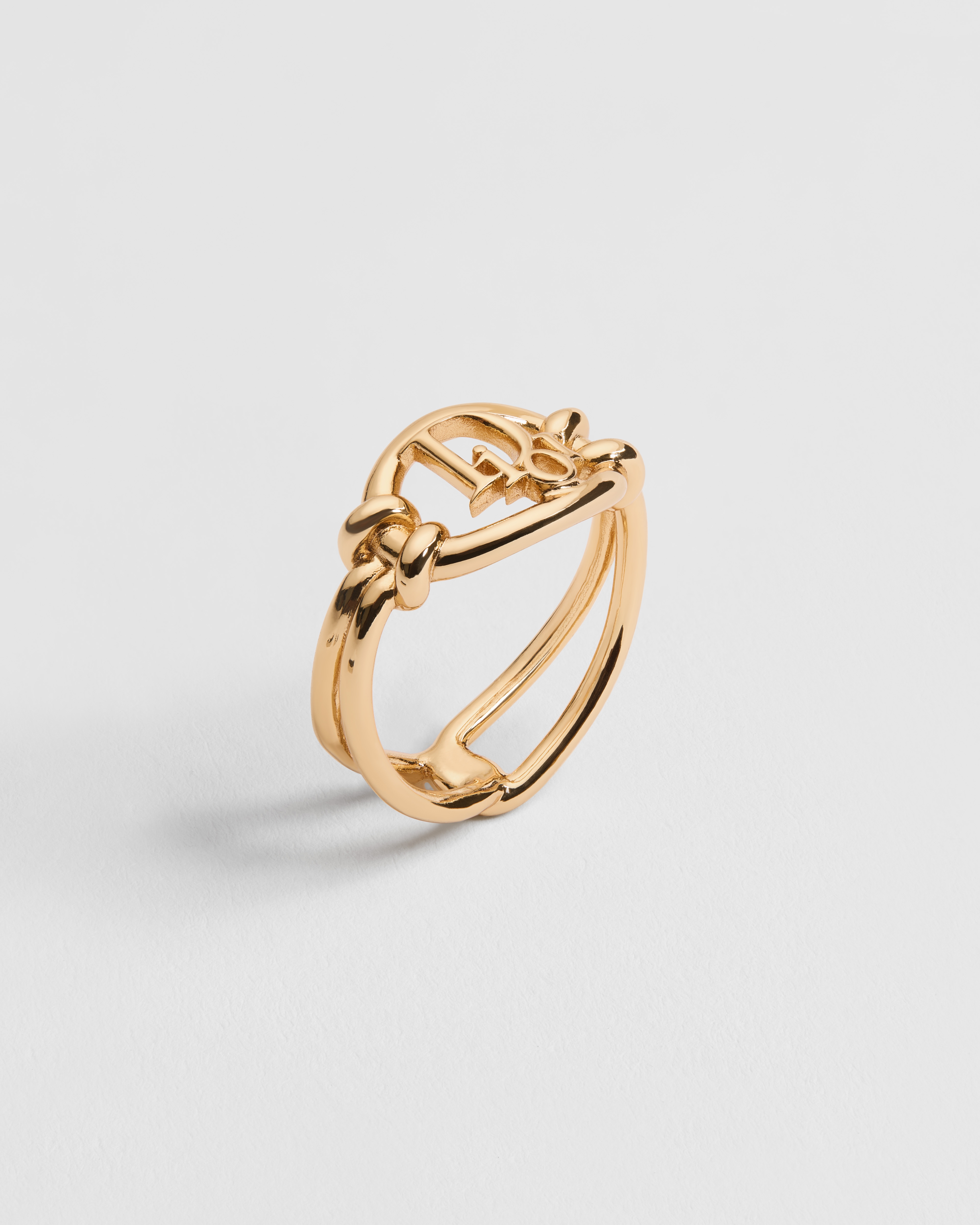 这款 Dior Oblique 戒指以现代设计重新诠释 Dior 经典标识。金色饰面金属设计,饰以镂空 Dior Oblique 标志图案,环绕椭圆形造型,融入精致的高订风范。可与其他 Dior Oblique 单品搭配,打造整体效果。